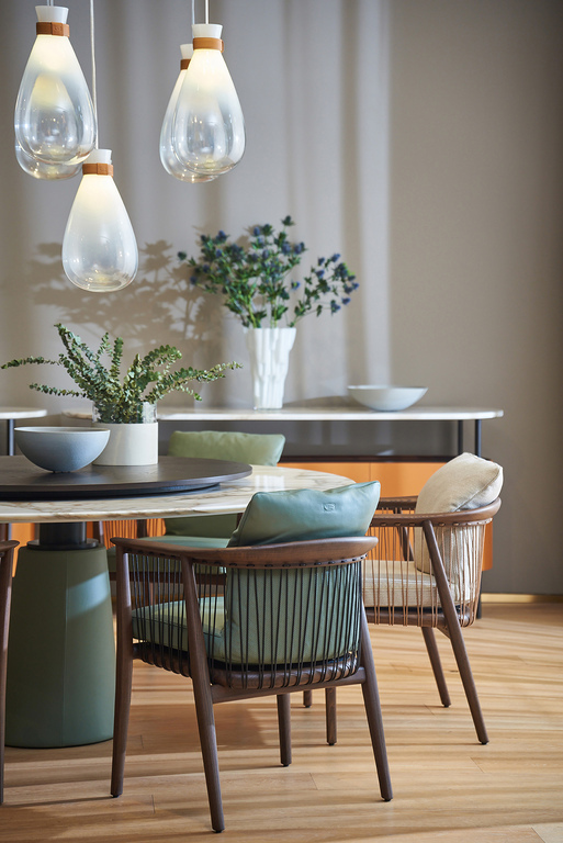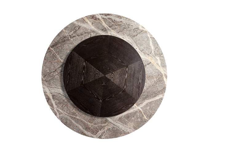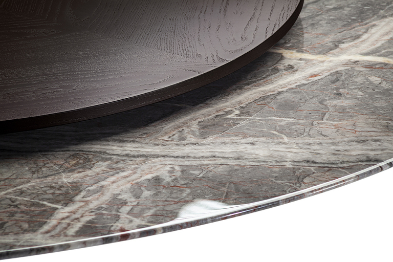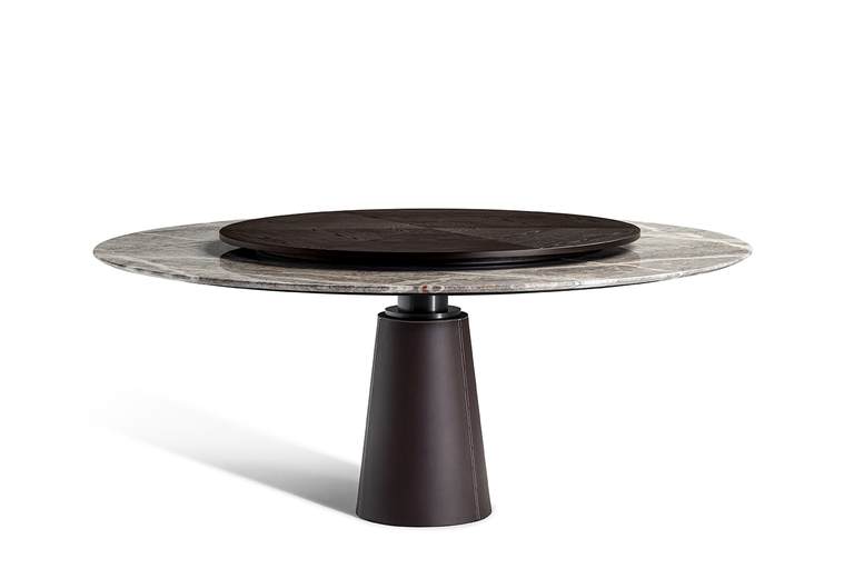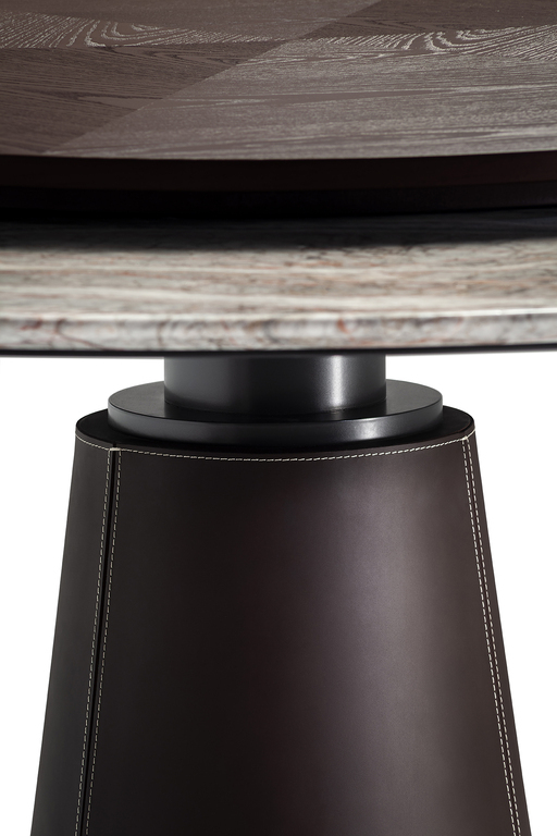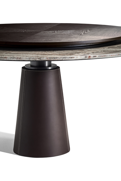 Столешница Mesa Due доступна в разнообразных вариантах отделки: от натурального дерева до кожи и мрамора. Выбор материалов впечатляет — от шпона ясеня с морилкой мока или венге до роскошного мрамора Calacatta и Fior di Pesco. Каждый элемент тщательно отобран, чтобы обеспечить долговечность и эстетическую привлекательность. Круглые столы могут быть обиты кожей Pelle Frau®, добавляя нотку утонченности и комфорта.