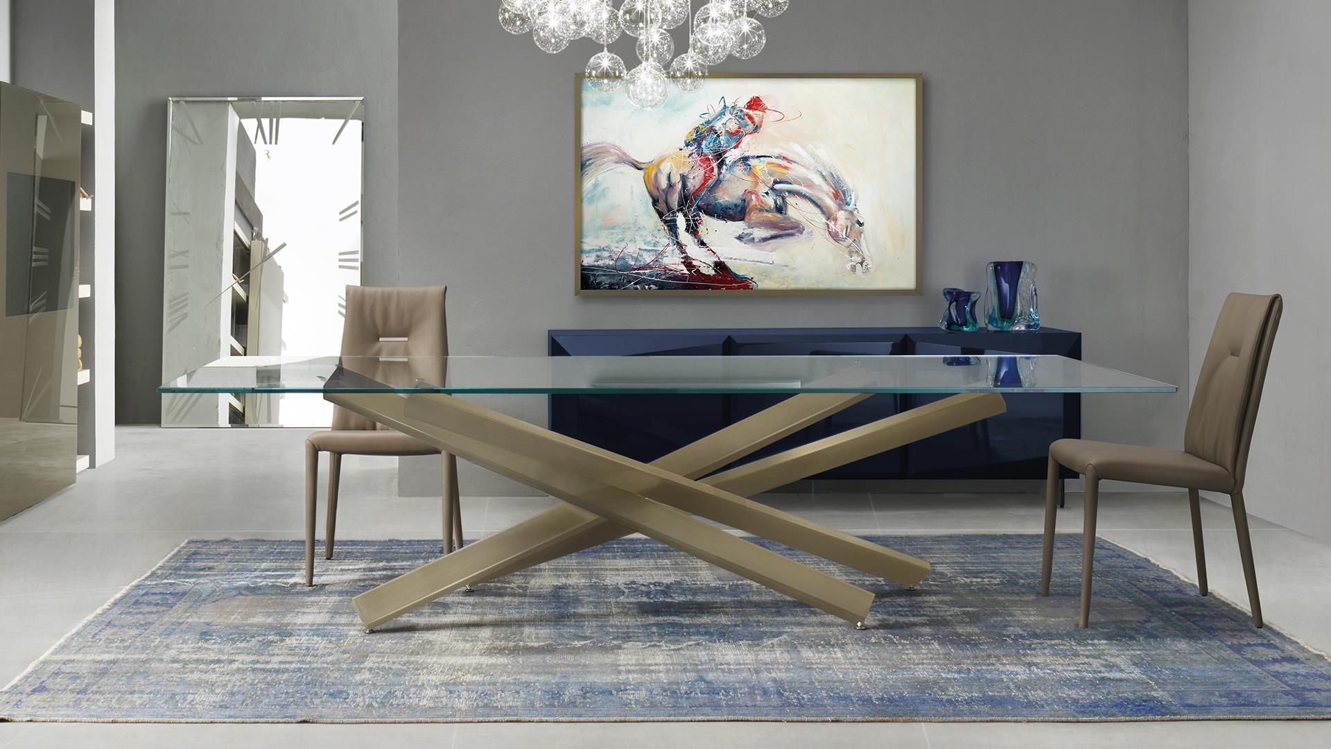 Обеденный стол MIKADO STEEL от итальянской фабрики REFLEXANGELO сочетает элегантность и современный дизайн. Основание доступно в железной отделке графит или атласных вариантах: латунь, темная латунь, титан, титановый темный. Столешница предлагается в нескольких исполнениях: прозрачное или копченое стекло, мраморное стекло.