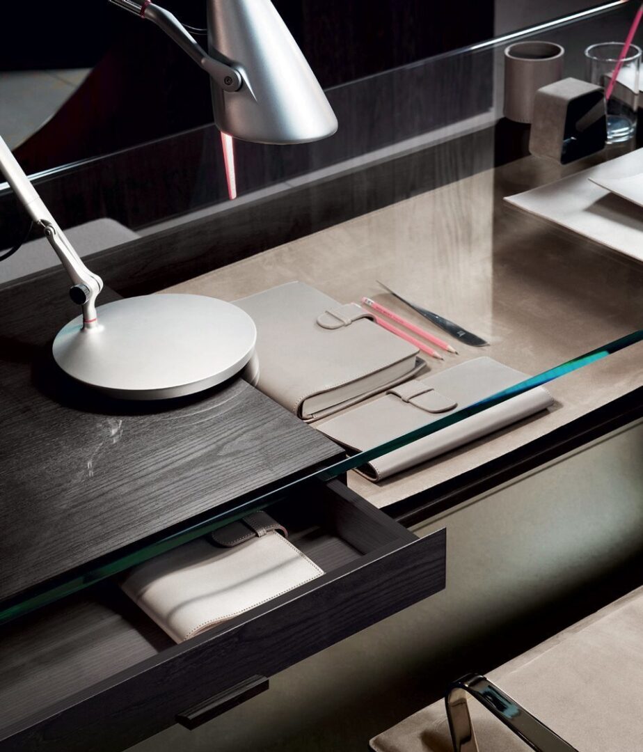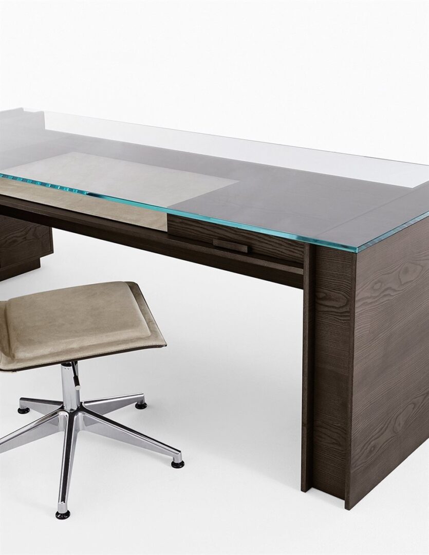 Стол Milano/Milano 1 от Gallotti&Radice – элегантное рабочее пространство в итальянском стиле. Модель Milano выполнена из натурального ясеня с отделкой под табак или черный цвет, дополнена прозрачной стеклянной столешницей 15 мм или вариантом «grigio Italia» (12 мм). В комплекте – коврик из замши или кожи.