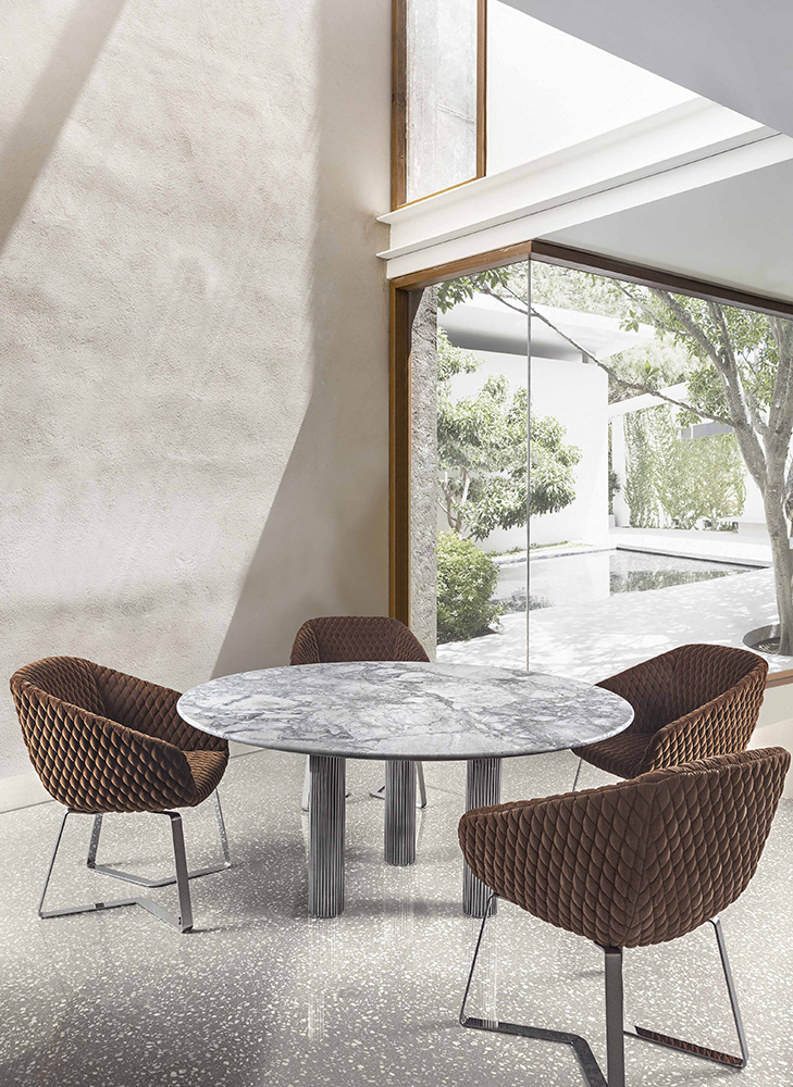 Представляем стол Miller от итальянской фабрики HESSENTIA — уникальное произведение искусства, которое добавит роскоши в любой интерьер. Столешница, выполненная из натурального мрамора, обладает полностью закругленным краем, а три цилиндрические ножки с хромированными деталями придают конструкции легкость и элегантность.