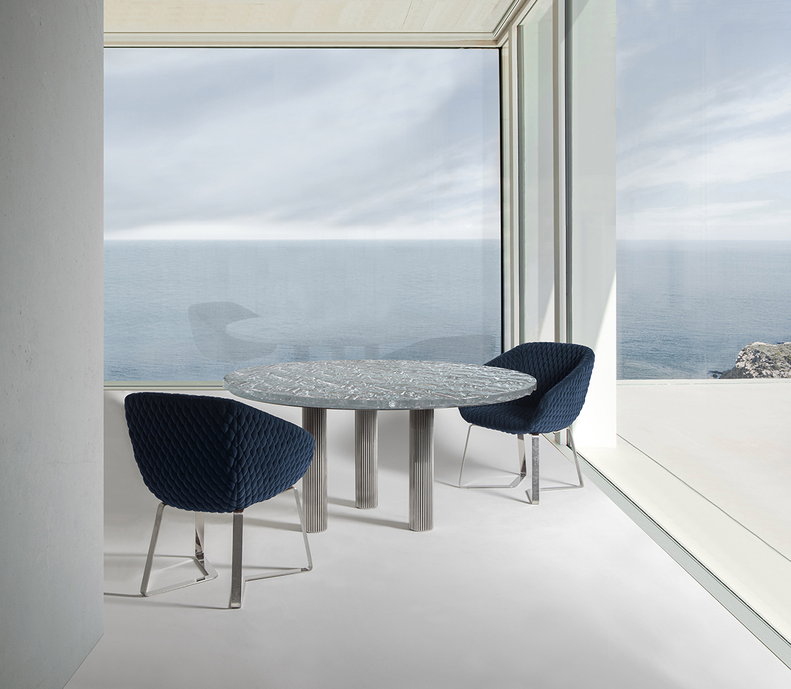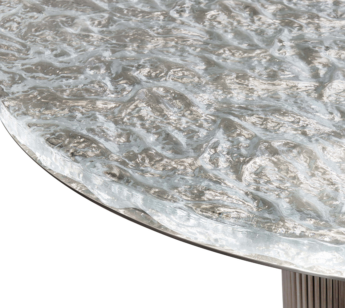 Стол Miller привлекает внимание своей оригинальной стеклянной столешницей, которая формируется с помощью сложного процесса литья стекла в металлической основе. Это обеспечивает большой размер и толщину, что, в свою очередь, делает каждую деталь стола уникальной. Стеклянная поверхность отражает свет и создает удивительные визуальные эффекты, напоминающие морскую рябь. Три цилиндрические ножки, покрытые хромированными металлическими стержнями, придают столу современный и стильный вид, гармонично сочетая с любыми элементами интерьера.