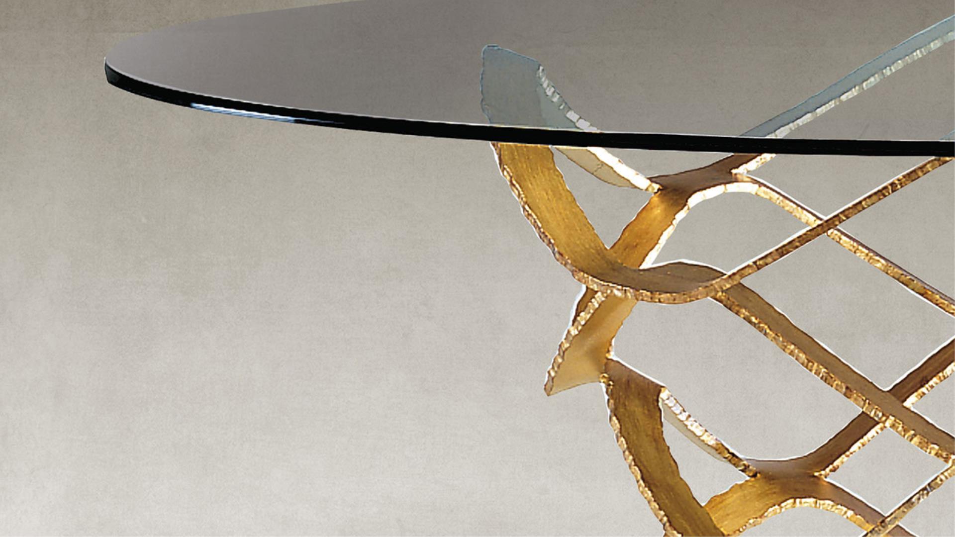 Обеденный стол NEOLITICO от итальянской фабрики REFLEXANGELO – воплощение роскоши и мастерства. Основание из кованого железа с отделкой сусальным золотом, серебряным листом, латунью и титаном придает столу благородный блеск. Стеклянная столешница толщиной 15 мм с фаской 45° добавляет современности и элегантности.