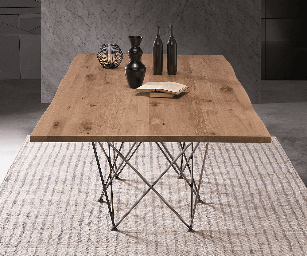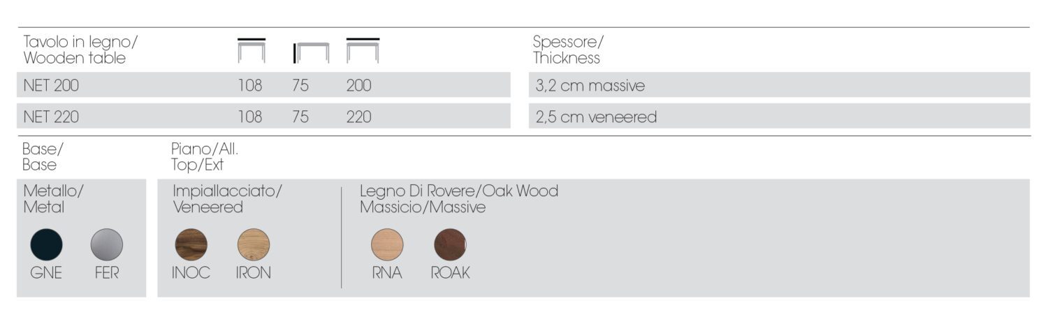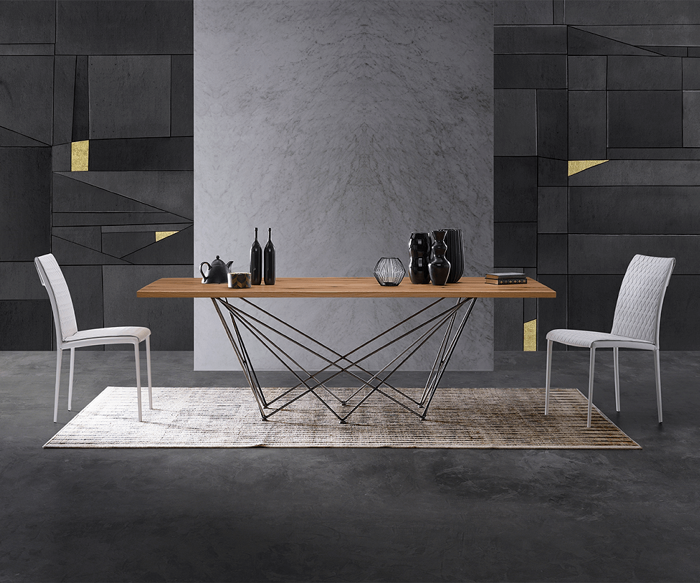 Стол Net от итальянской фабрики NOVAMOBILI — воплощение современного дизайна и функциональности. Основание стола выполнено в виде геометрического переплетения серо-черных лакированных или железных стержней, создавая эффект легкости и динамики. Столешница доступна в двух размерах и двух вариантах исполнения: шпонированный или массив дуба, что позволяет подобрать идеальное решение для любого интерьера.
