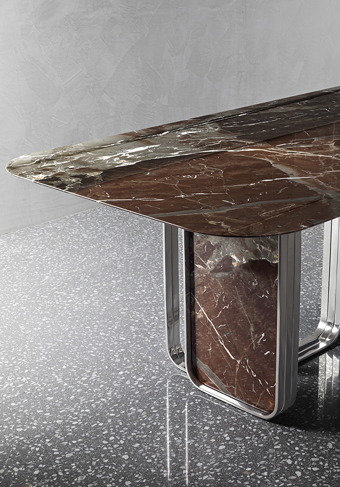 Каждая деталь стола Nova выполнена вручную, что делает его поистине уникальным произведением искусства. Латунный металл, словно лента, обвивает мраморные плиты, а контраст глянцевой и матовой отделки создает интересный визуальный эффект. Этот стол доступен в различных размерах — от 200 см до 280 см в ширину, что позволяет выбрать оптимальный вариант для вашего интерьера: