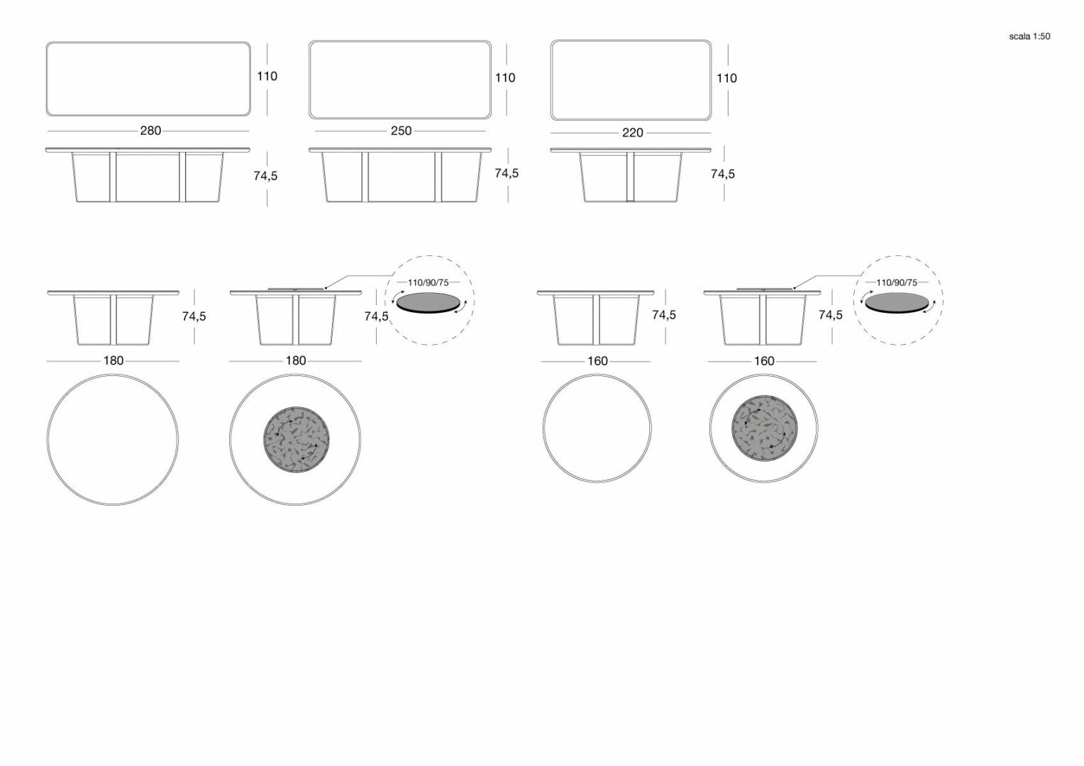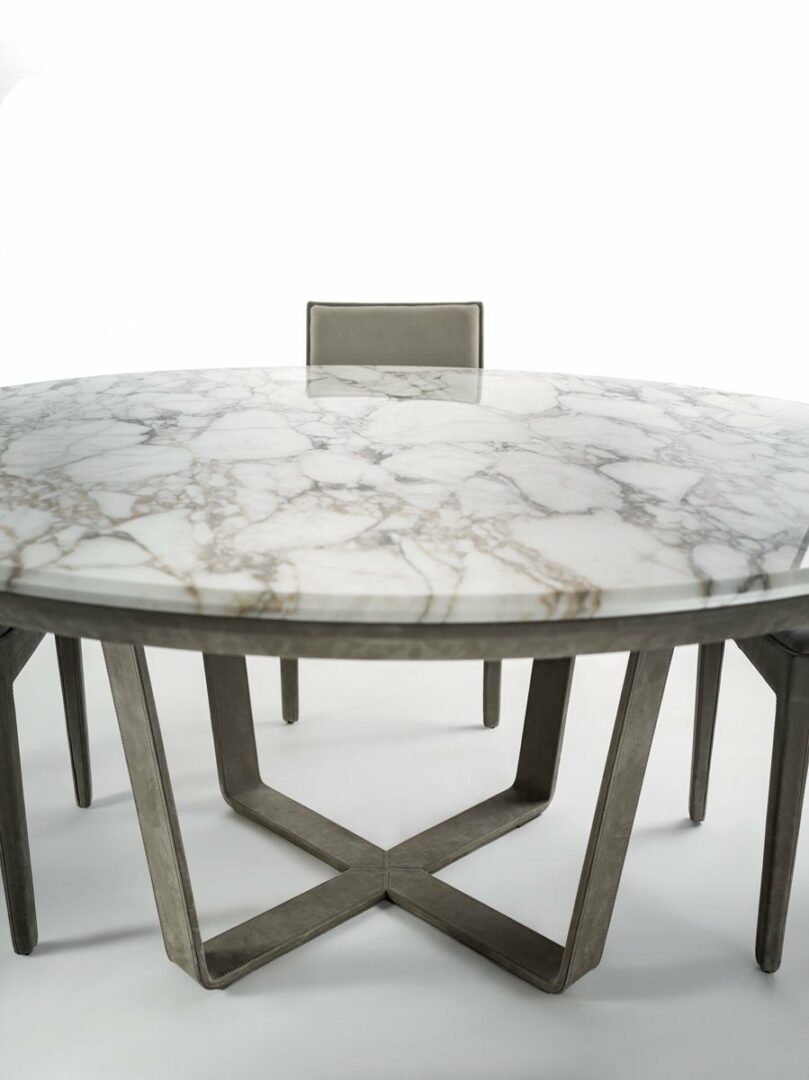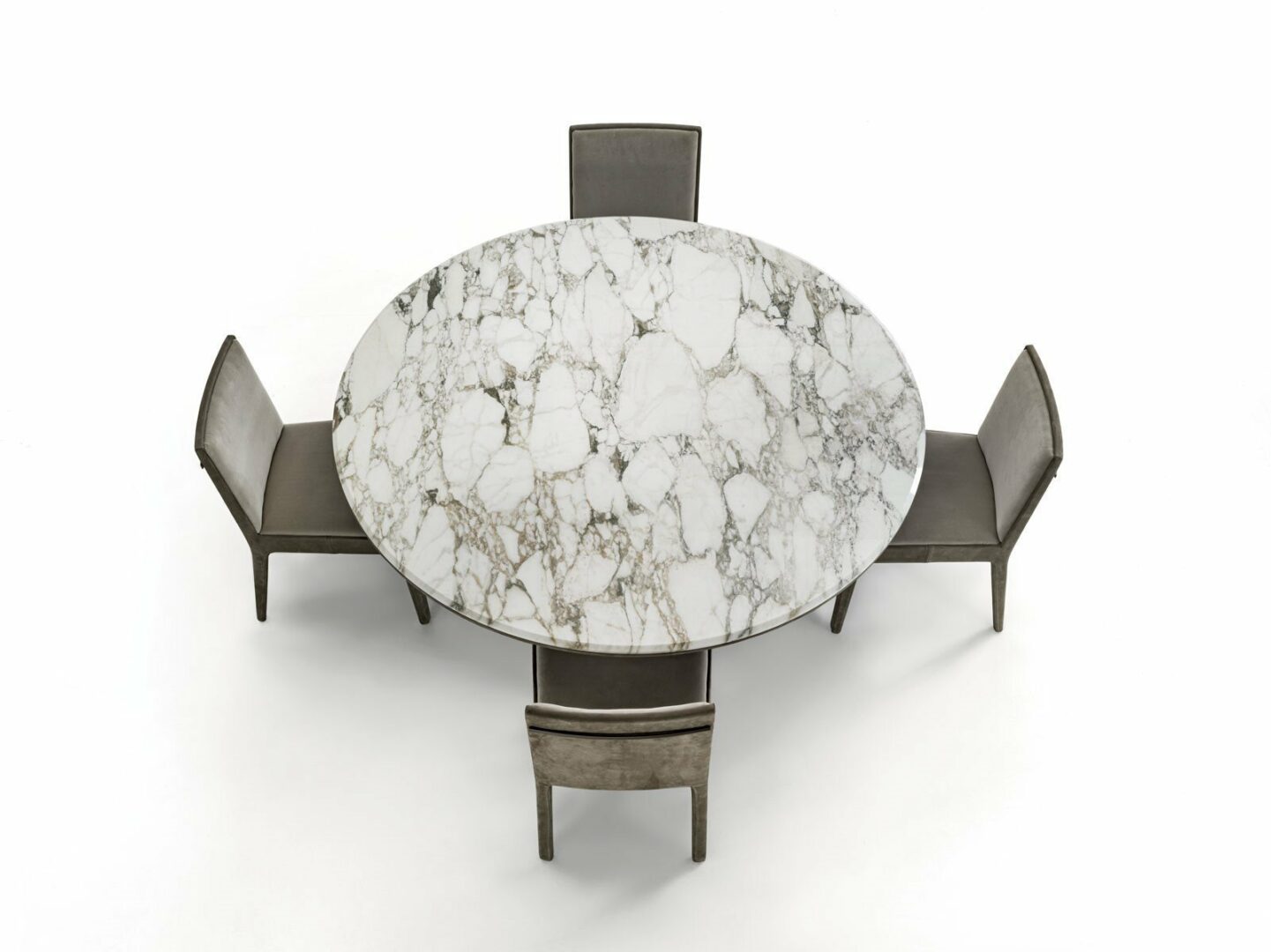 Стол OMEGA предлагает несколько вариантов отделки, включая великолепные мраморы, такие как Fusion Light, Patagonia, Explosion Blu и многие другие. Столешницы выполнены из бронзового или дымчатого зеркала, что добавляет изысканности и глубины. Круглый стол может быть дополнен поворотной поверхностью диаметром от 75 до 110 см, что делает его идеальным для уютных семейных ужинов или в качестве центрального элемента для больших торжеств.