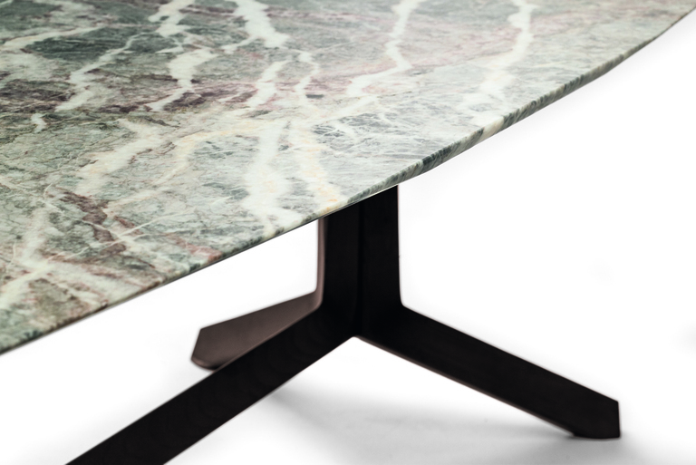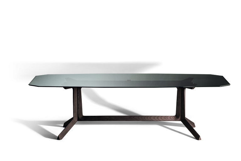 Стол выделяется уникальной деревянной конструкцией с треугольным сечением и алмазной обработкой краев столешниц. Доступные материалы, такие как дымчатое стекло и мрамор Fior di Pesco, добавляют эстетической роскоши и прочности.