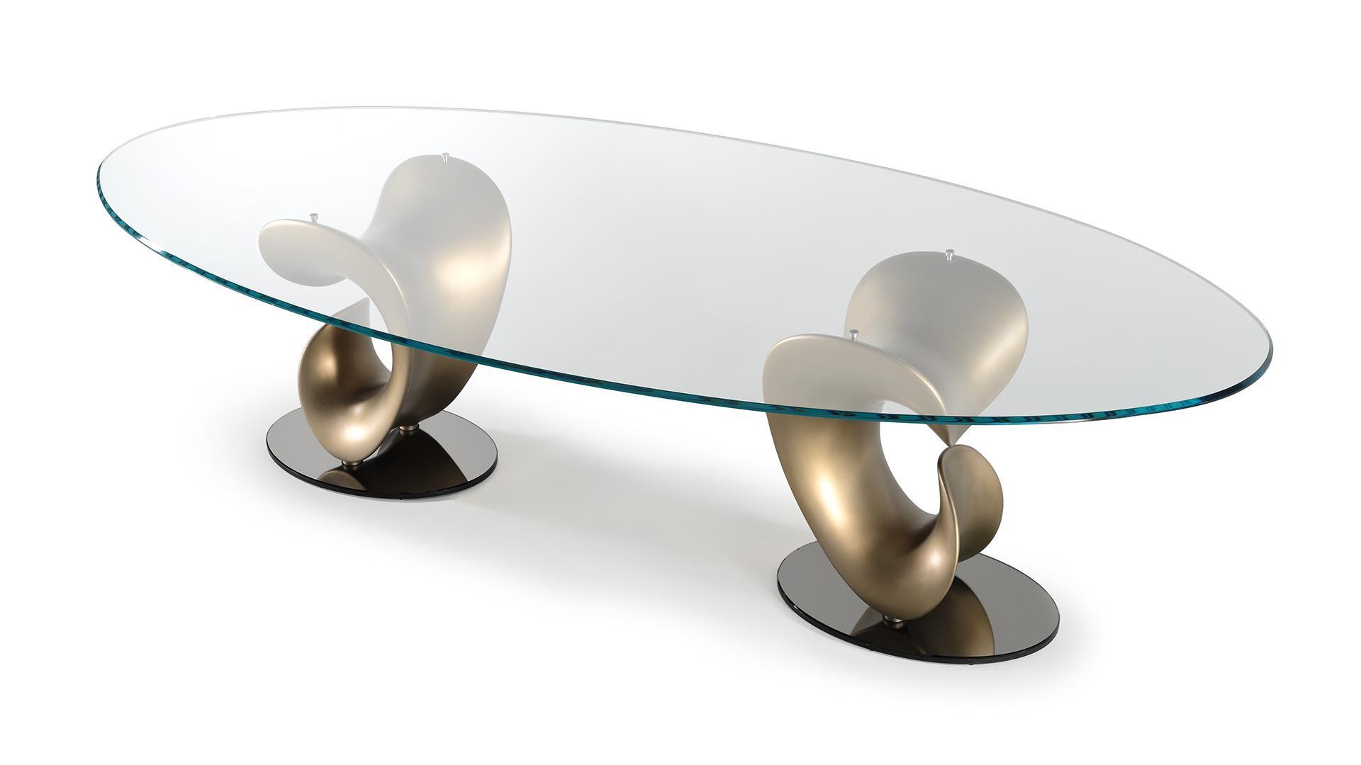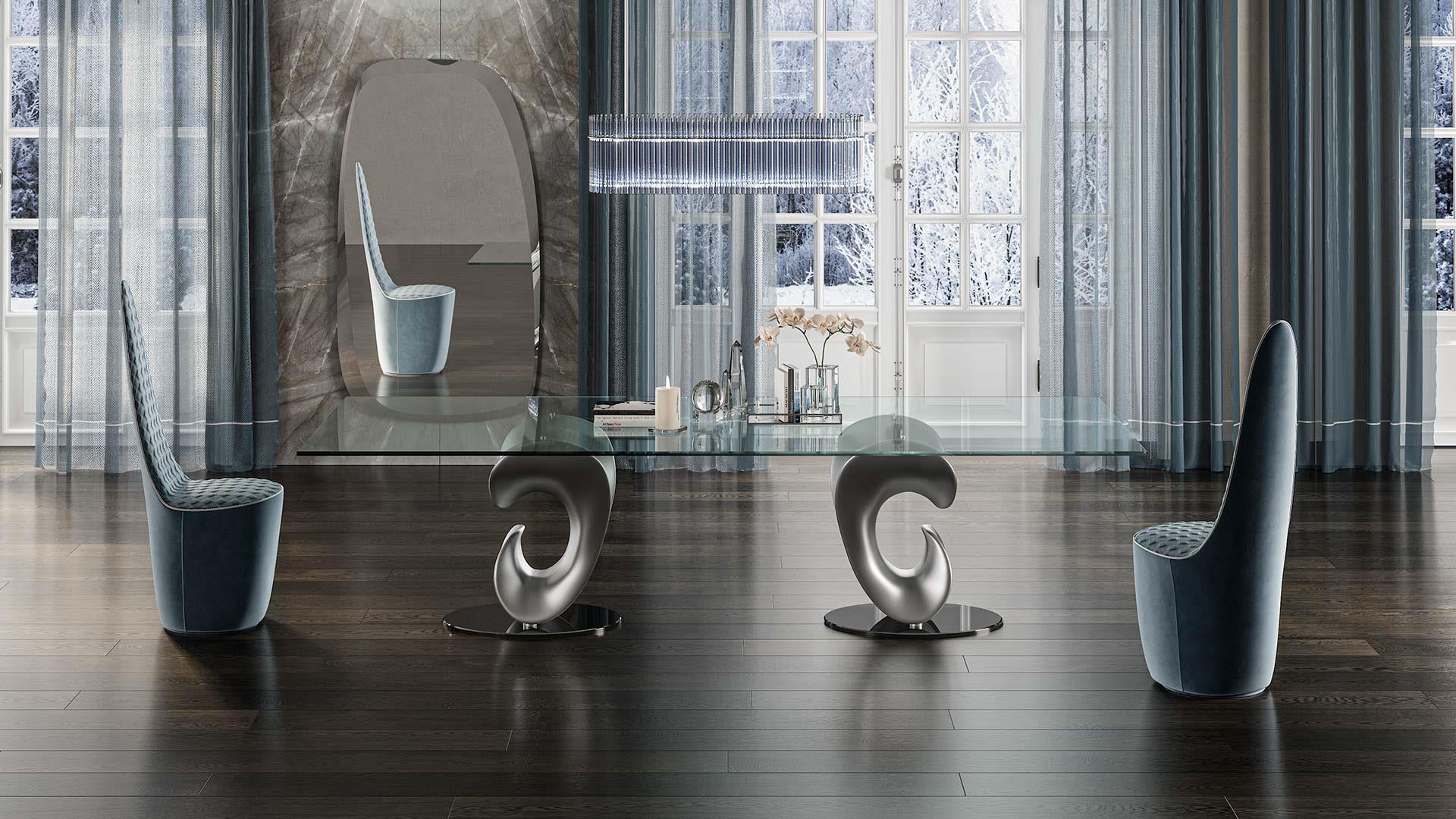 Стол PARENTESIS отличается скульптурными линиями, которые придают ему динамику и современность. Его дизайн — это смелое сочетание классических пропорций и новаторских решений, характерных для итальянских мастеров. Овальная или круглая столешница, плавно переходящая в изящные опоры, создает ощущение легкости, несмотря на монументальность.