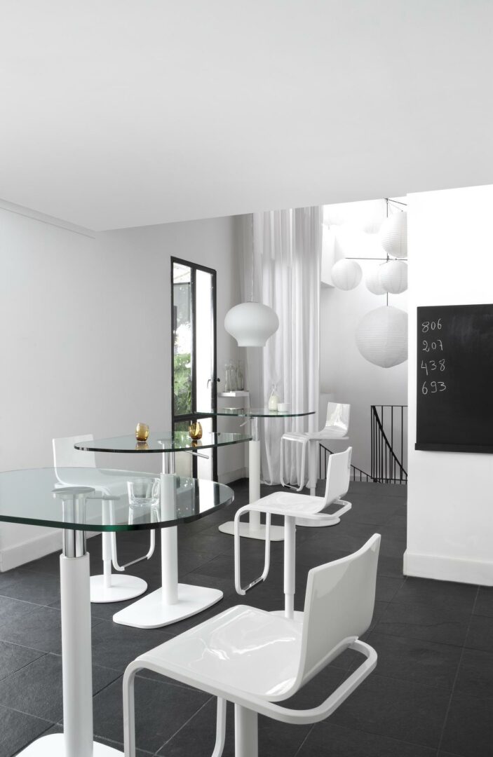 Основание из эпоксидной лакированной и хромированной стали придает столу легкость и стиль. Высота регулируется от 75,5 до 100,7 см, превращая обеденный стол в барный. Вмещает до 4 человек. Идеальное сочетание функциональности и дизайна.