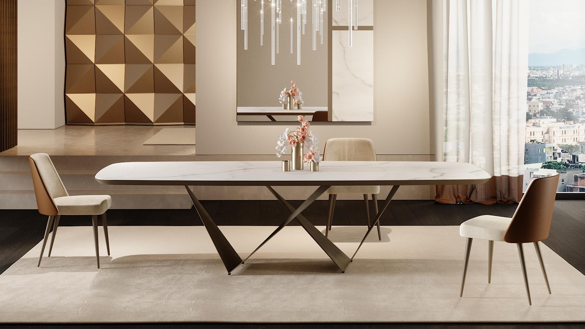 Стол PRISMA STEEL сочетает в себе строгую геометрию и утонченную элегантность. Его конструкция — это игра контрастов: массивная столешница с выразительной текстурой и изящные металлические опоры, создающие эффект легкости. Такой дизайн идеально впишется как в современные минималистичные интерьеры, так и в классические апартаменты, добавляя им нотку современного шика.