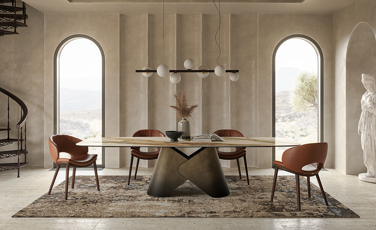 Стол Scott Keramik поражает своей уникальной формой и элегантным центральным основанием, состоящим из двух изогнутых металлических пластин, перекрывающихся, как бы образуя воротник рубашки. Каждая деталь тщательно проработана, что подчеркивает мастерство итальянских дизайнеров. Четкие линии и грани придают столу современный и строгий вид, а художественный подход к его созданию делает его центром притяжения в любом интерьере.