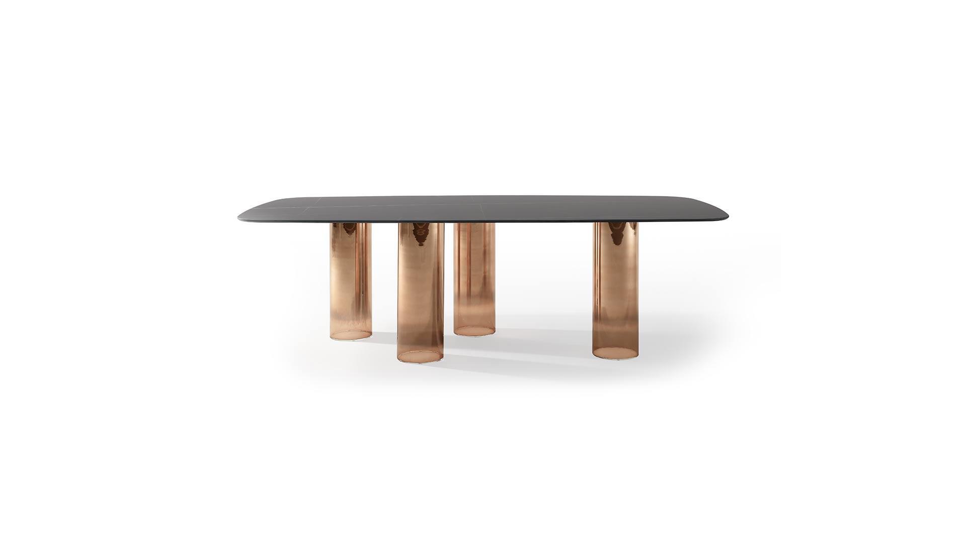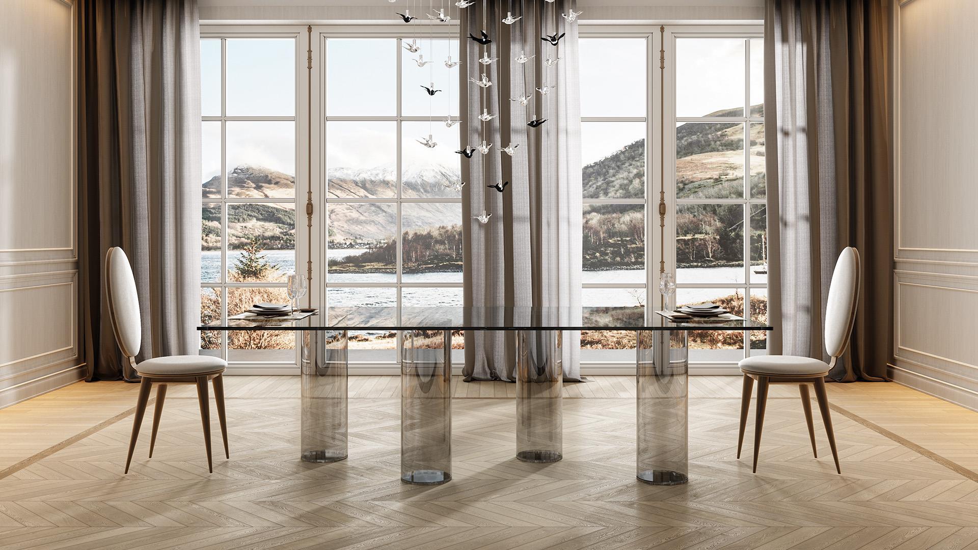 Обеденный стол SIGNORE ANELLI от итальянской фабрики REFLEXANGELO – воплощение элегантности и мастерства. Основание из прозрачного муранского стекла доступно в насыщенных оттенках: красном, синем, аквамарине, янтаре, табаке или аметисте. Столешница предлагается в трех вариантах: прозрачное стекло 15 мм с полированной кромкой, мраморное стекло или фацетированное дерево Bevel Wood.