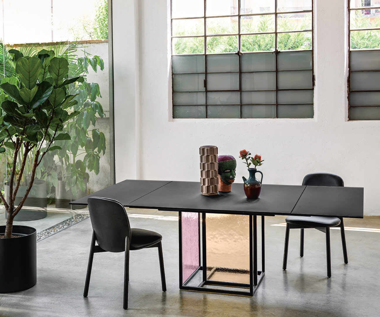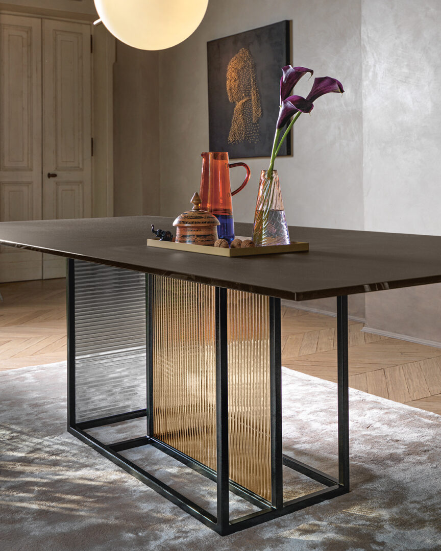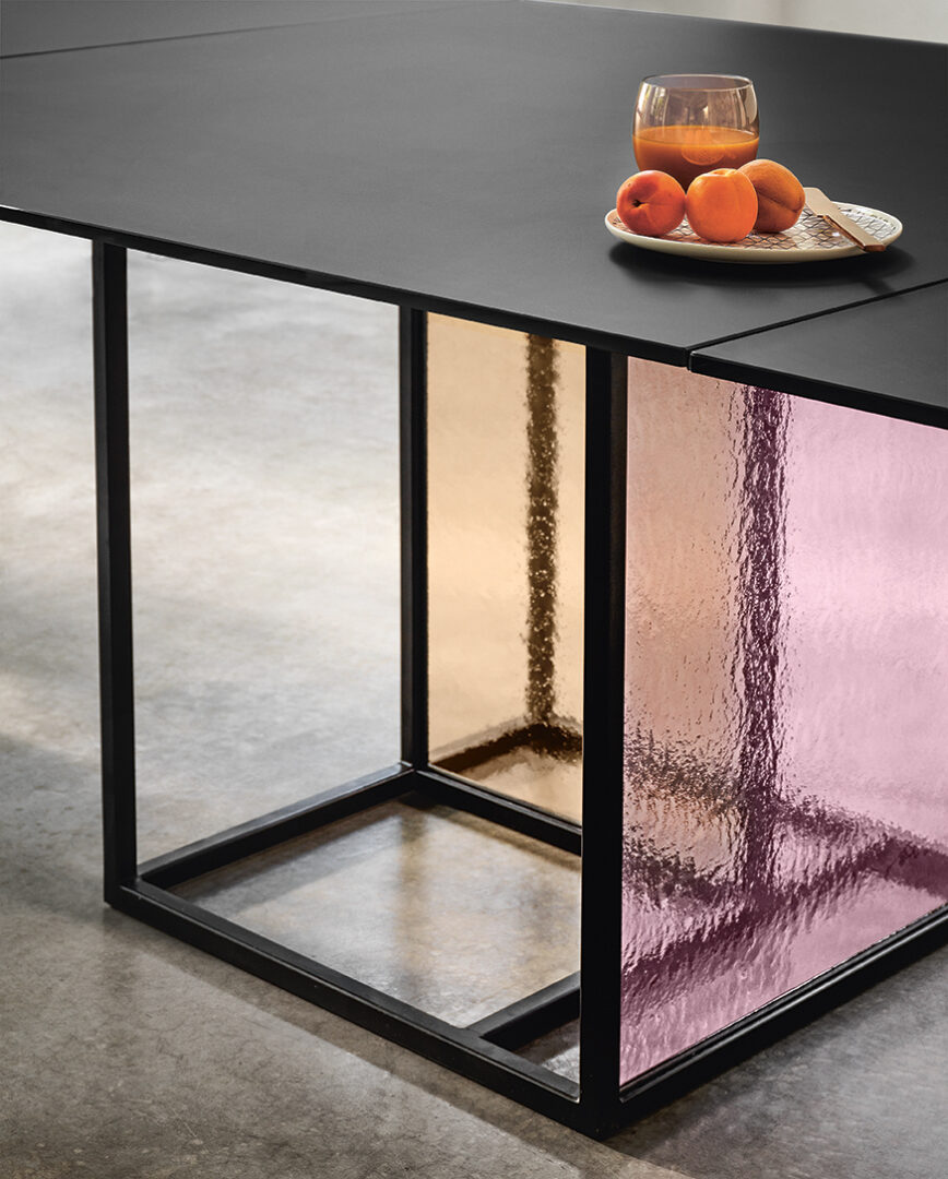 Стол Theo от итальянской фабрики Fiam Italia — воплощение элегантности и технологичности. Основание выполнено из прочного металлического каркаса с матовой черной отделкой, дополненного двумя слоями закаленного стекла толщиной 6 мм. Доступны варианты с копченым, бронзовым или прозрачным стеклом с рельефной текстурой в оттенках Amber и Antique Rose.