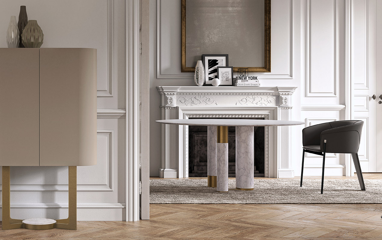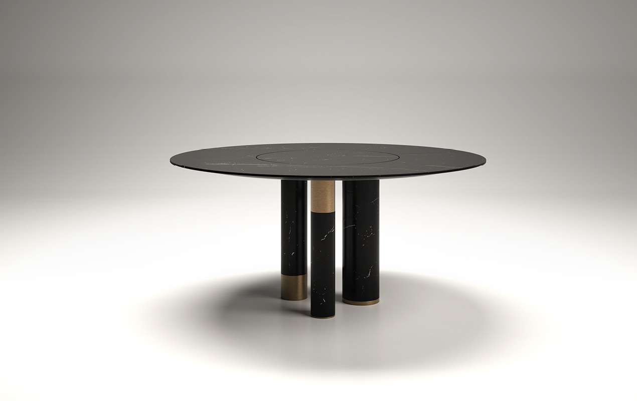 Авторский проект Маурицио Манцони сочетает в себе смелые архитектурные решения и элегантную сдержанность. Стол представлен в трех диаметрах — 150, 160 и 180 см, что позволяет идеально вписать его как в просторные апартаменты, так и в уютные приватные пространства. Основание из массивного мрамора с металлическими деталями создает эффект «парящей» столешницы, придавая интерьеру динамику и современность.