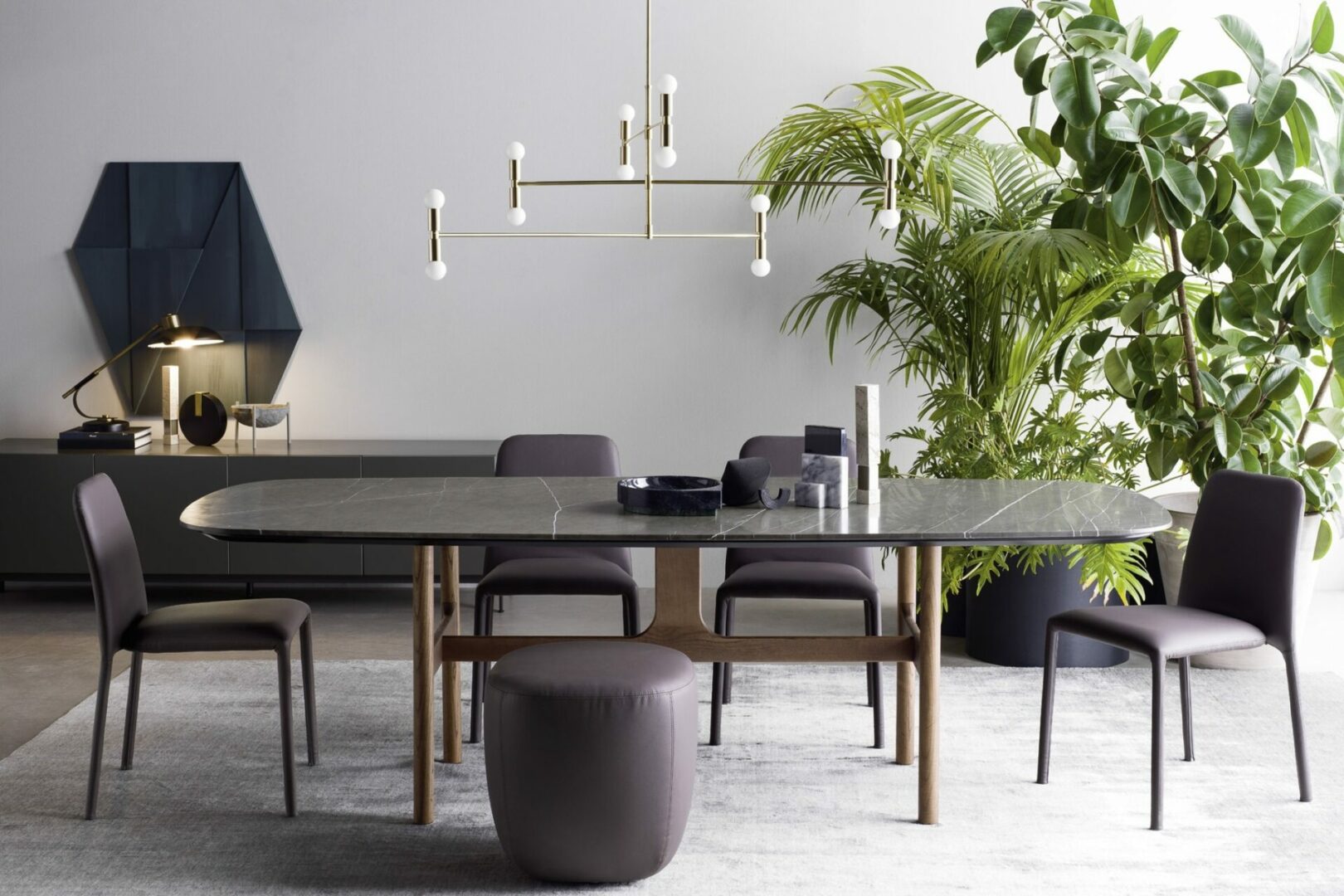 Его универсальный дизайн позволяет комбинировать его с любыми стульями — от бархатных кресел до минималистичных моделей.