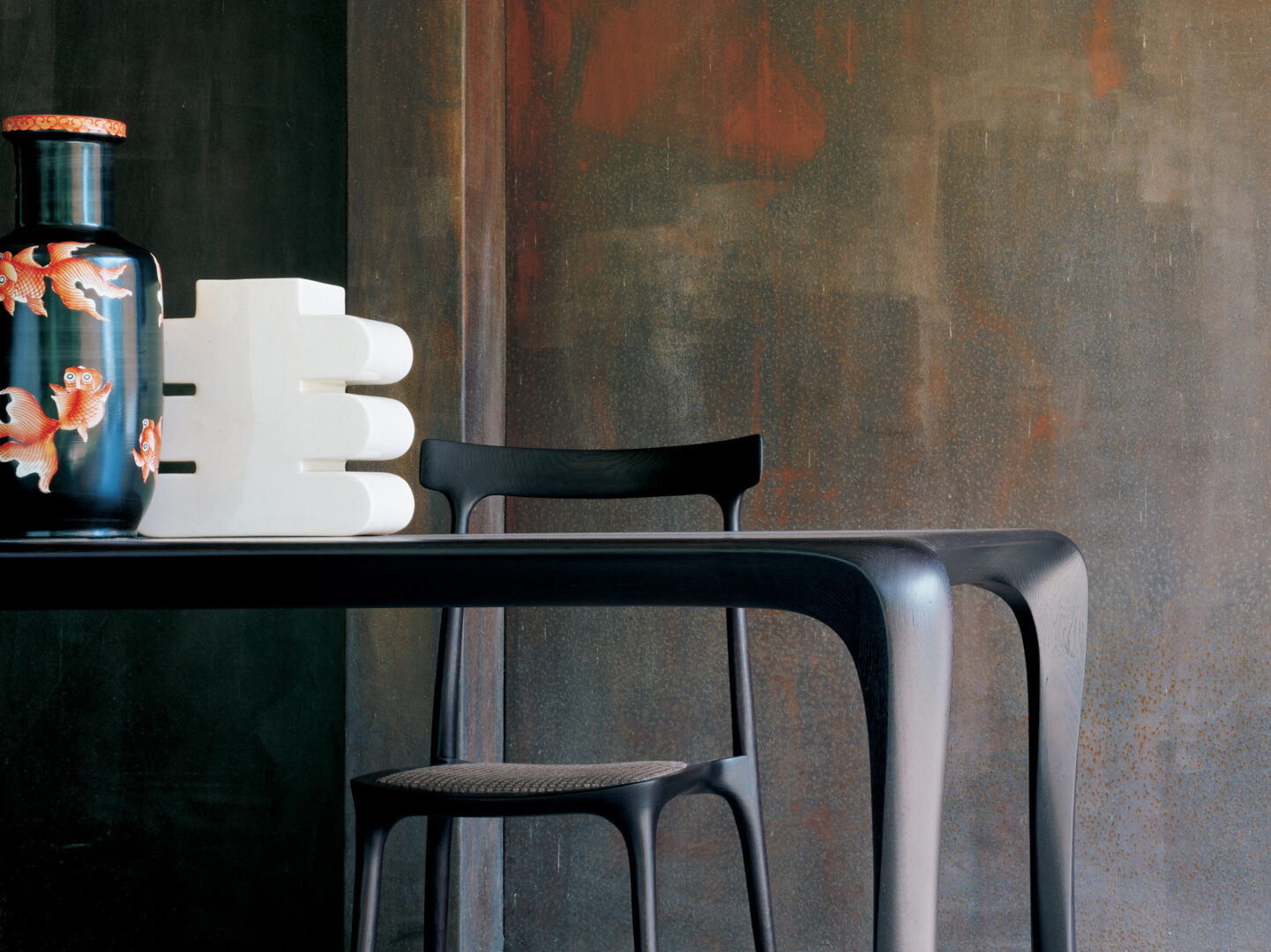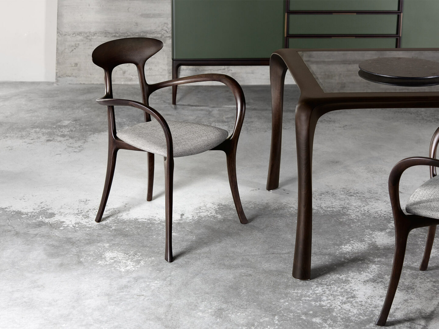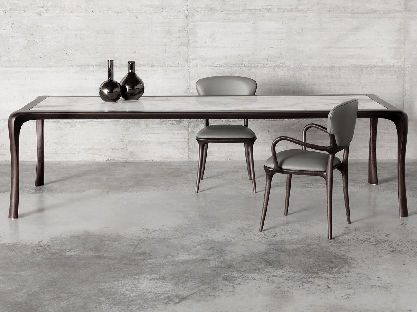 Стол изготовлен из массива американского грецкого ореха, что гарантирует не только его долговечность, но и высокую эстетическую ценность. Каждая деталь обработана вручную, что подчеркивает исключительное мастерство итальянских дизайнеров. Ножки из атласной никелевой латуни придают конструкции не только прочность, но и элегантный вид, обеспечивая стабильность и уверенность в каждом движении.
