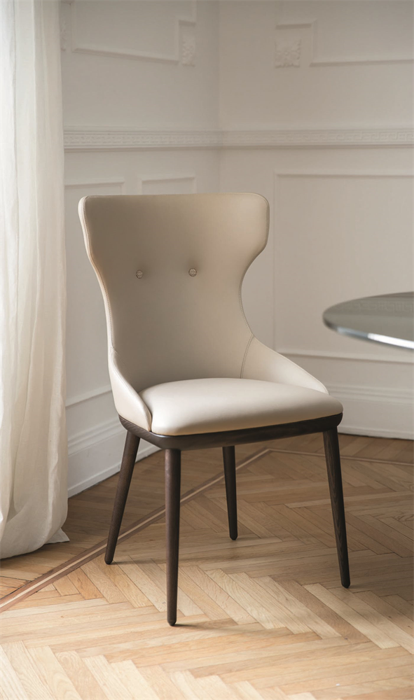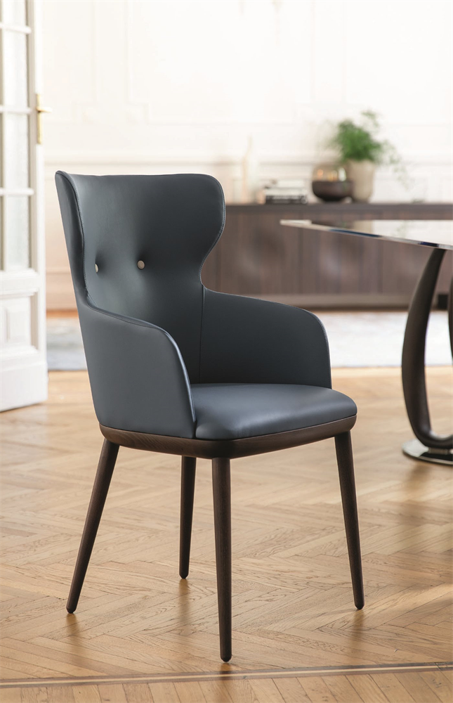 Изготовленный из массива ясеня, этот стул сочетает в себе прочность и элегантность. Обивка выполнена из тканей коллекции, что позволяет легко интегрировать его в любой интерьер.
