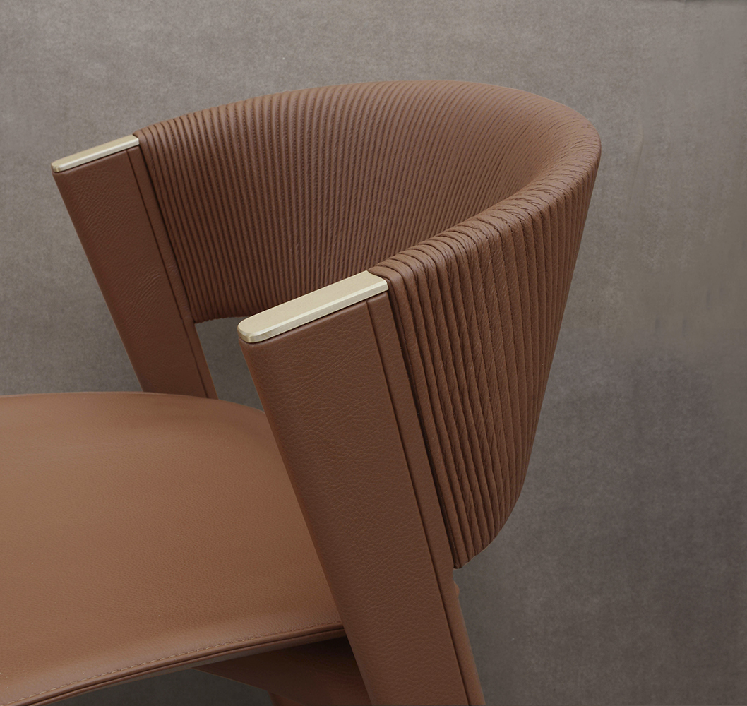 Элегантные передние ножки из кленового дерева с глянцевой отделкой цвета «мокко» и стильные металлические вставки создают уникальный акцент. Задние ножки и спинка выполнены из кожи с эффектом «плиссе», добавляя шарма и уюта.