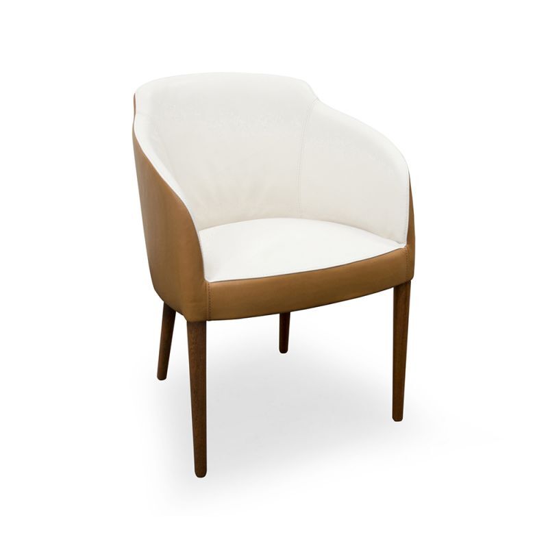 Стул ROD от итальянской фабрики FORMITALIA – воплощение элегантности и комфорта. Сиденье и спинка выполнены из мягкой кожи Daino молочного цвета с аккуратной строчкой, а outback – из кожи оттенка виски. Прочные ножки из красного дерева с матовым лаковым покрытием придают модели благородный вид.