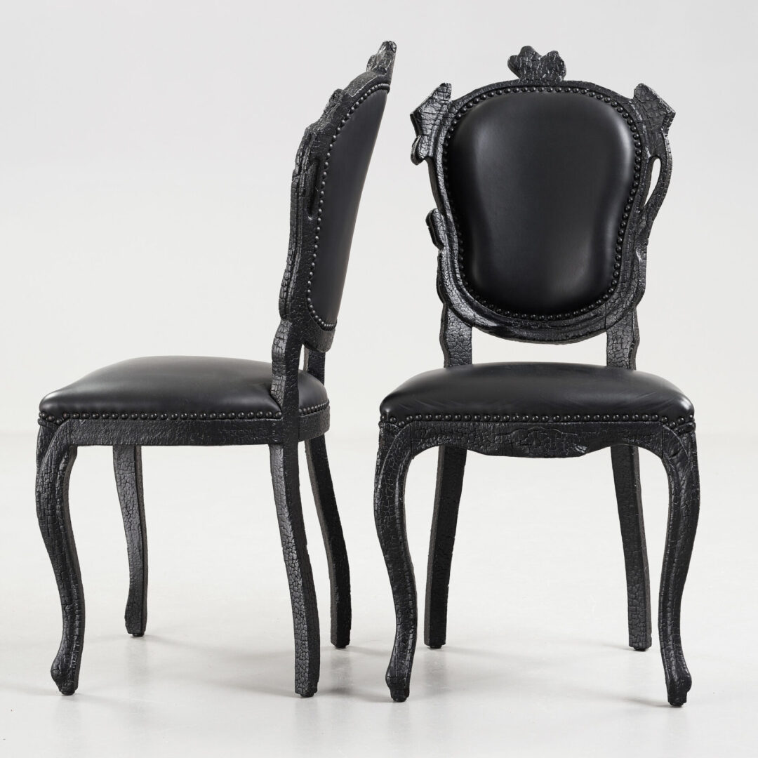 Обеденный стул SMOKE Dining Chair от итальянской фабрики MOOOI – воплощение смелого дизайна и ручной работы. Деревянный каркас, обработанный огнем для создания уникальной текстуры, сочетается с элегантной черной кожаной обивкой сиденья и спинки.