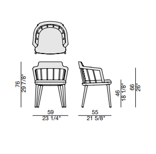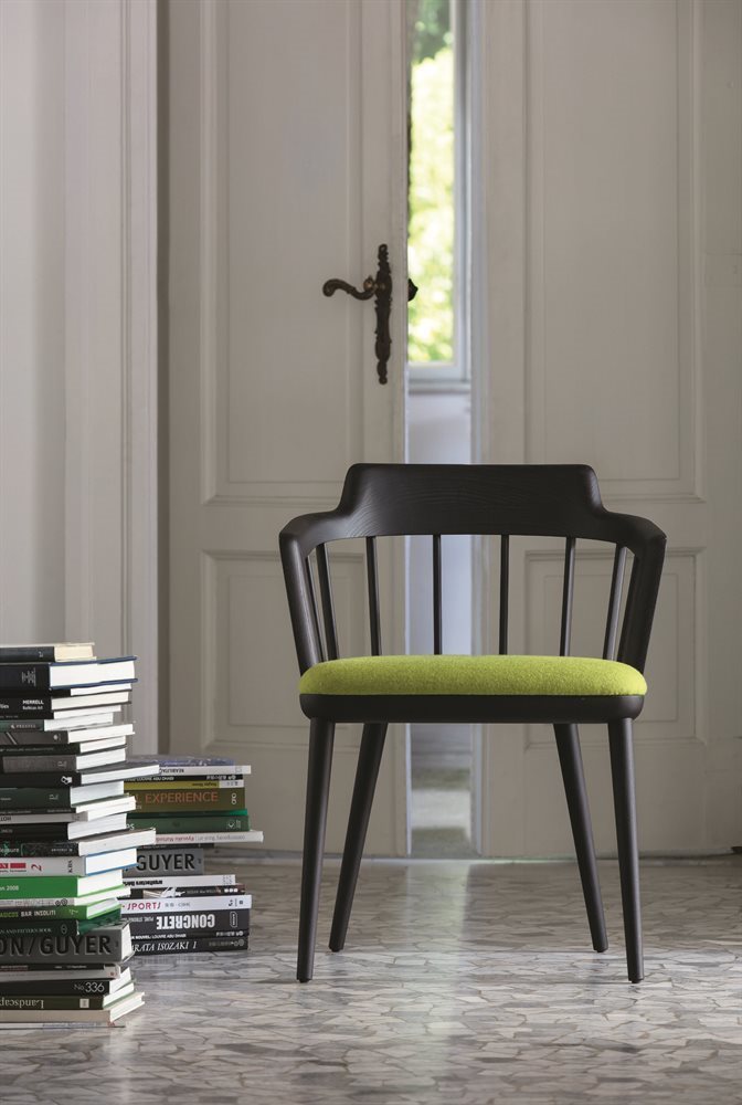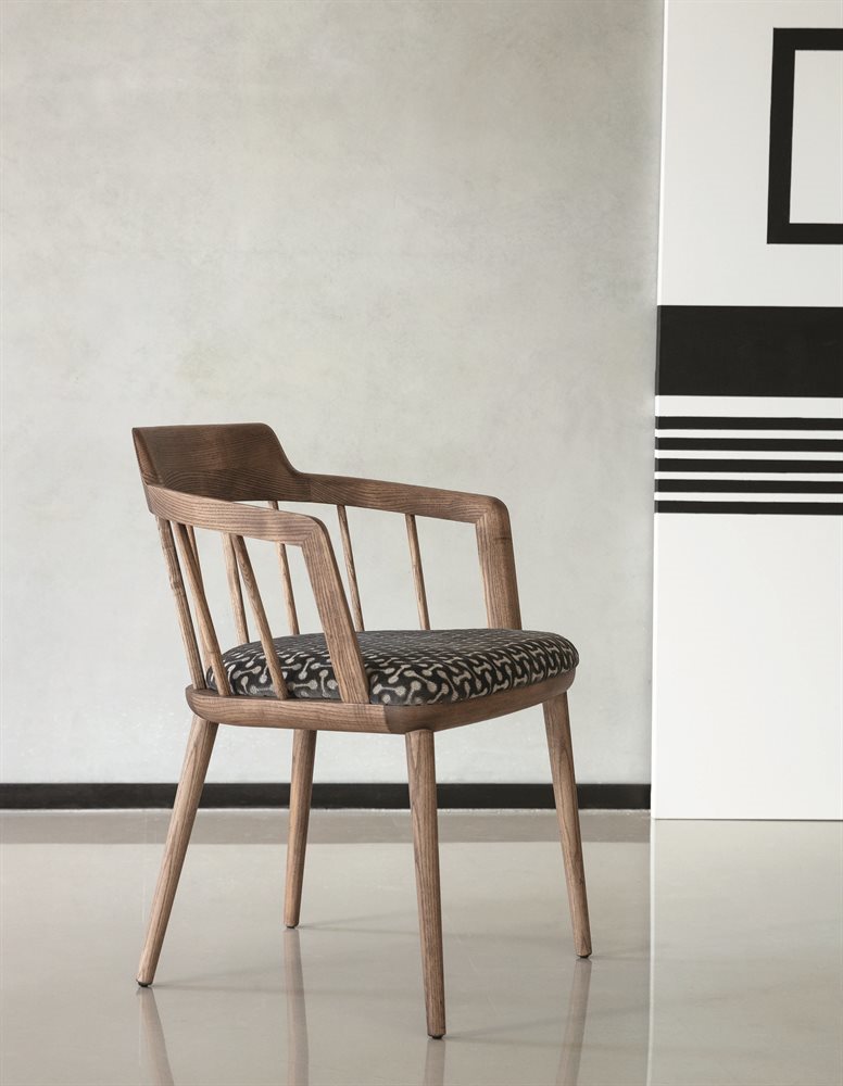 Стул с подлокотниками отличается прочным каркасом из ясеня и мягким сиденьем, обитым тканями из эксклюзивной коллекции.