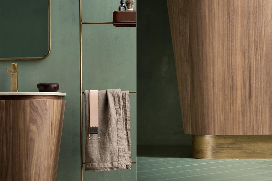 Коллекция SUEDE №1 от итальянской фабрики Cerasa – это воплощение роскоши и комфорта в мебели для ванных комнат. Мягкие формы и изогнутые линии создают атмосферу уюта, а сочетание дерева грецкого ореха Canaletto с полированной античной бронзой придает интерьеру благородный шарм.