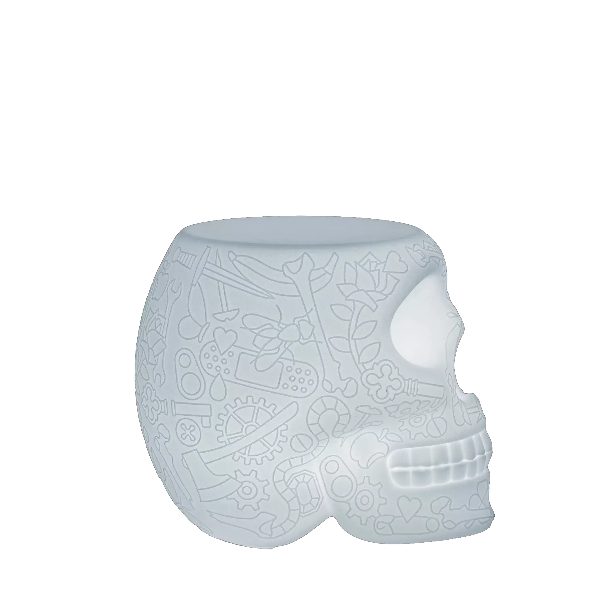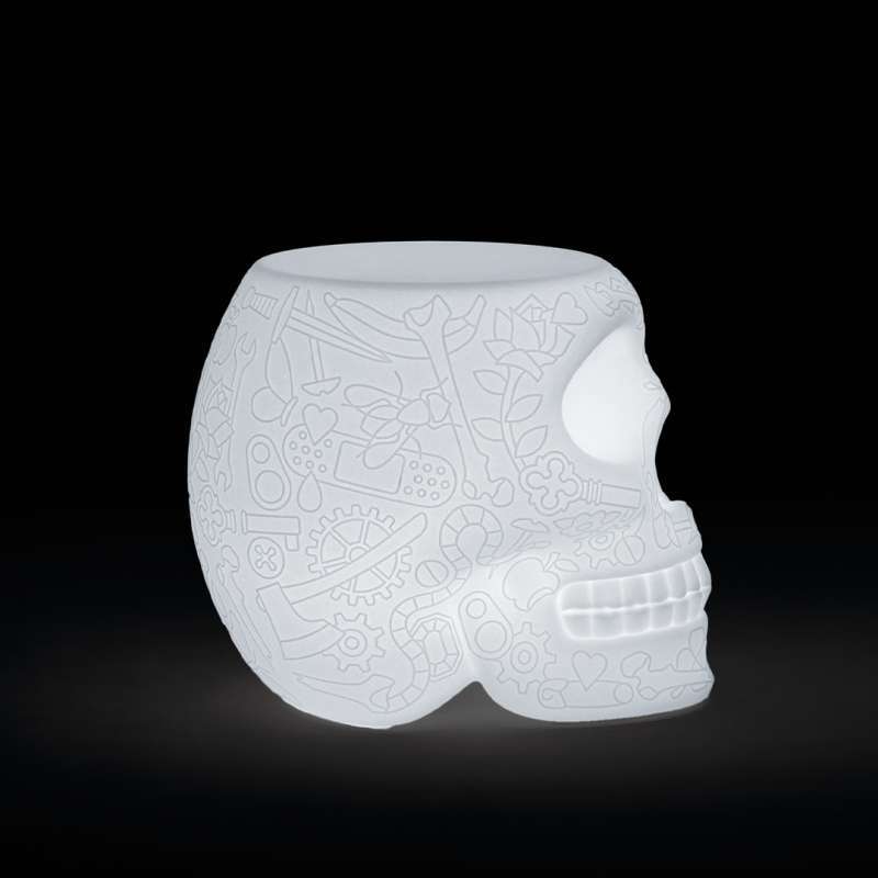 Табурет MEXICO STOOL AND SIDETABLE LAMP от итальянской фабрики QEEBOO — это уникальный предмет, сочетающий функциональность и художественный замысел. Разработанный Studio Job, он выполнен в форме черепа с графическим рисунком, вдохновленным мексиканскими традициями. Многофункциональный дизайн позволяет использовать его как табурет, приставной столик и светильник.