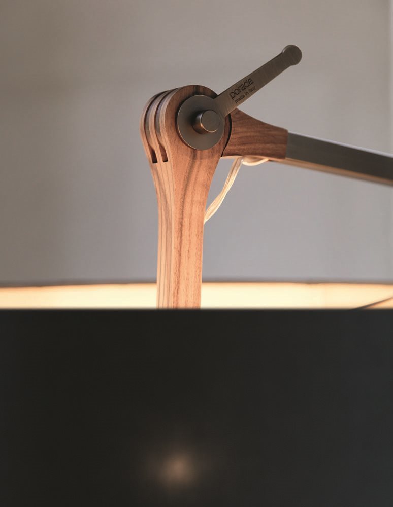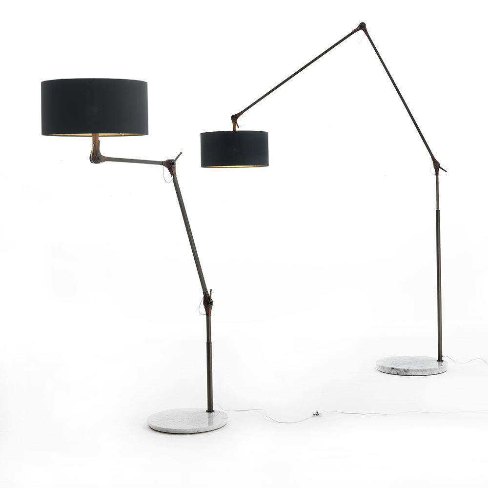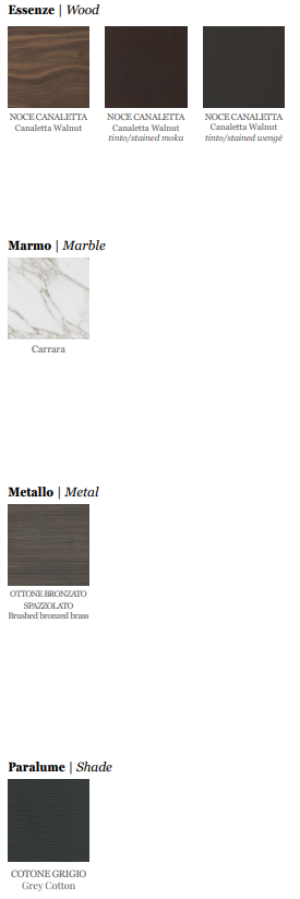 Его трубчатая структура выполнена из матовой бронзовой латуни, а шарнир из массива ореха каналетта придаёт изысканность. Основание из каррарского мрамора обеспечивает устойчивость, в то время как абажур из серого хлопка с золотой внутренней частью создает теплое и уютное освещение.