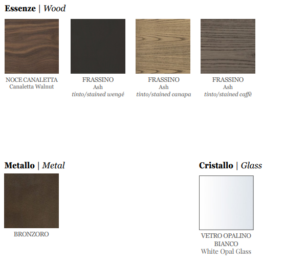 Изготовленный из массива ореха каналетта или ясеня, он обладает изысканным цоколем в отделке Bronzoro и диффузором из белого опалового стекла.