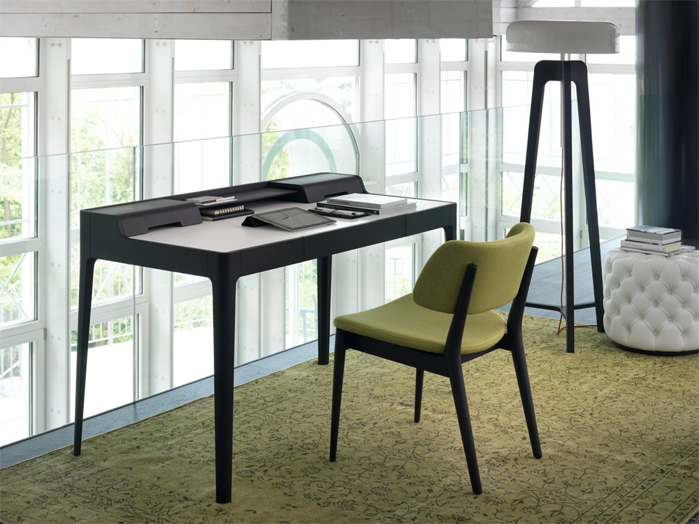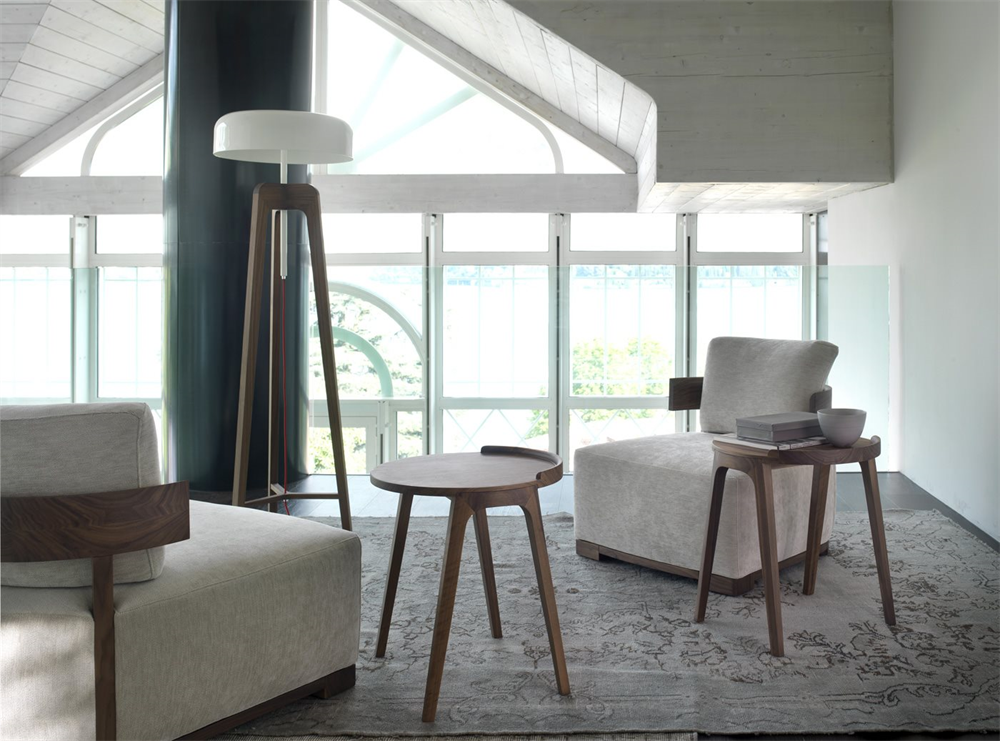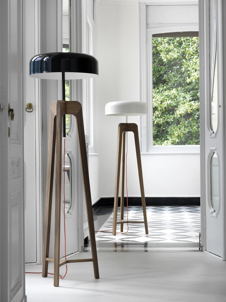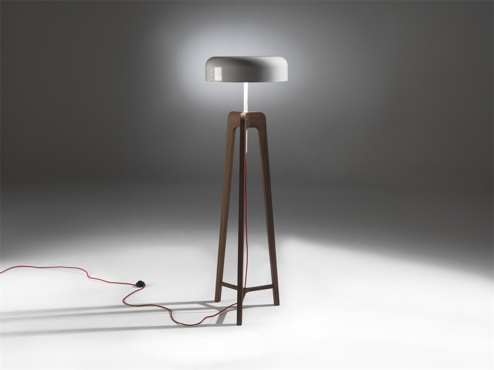 Изготовленный из массива ореха каналетта или ясеня, он оснащен абажуром из листового металла, что обеспечивает элегантное сочетание материалов и текстур.