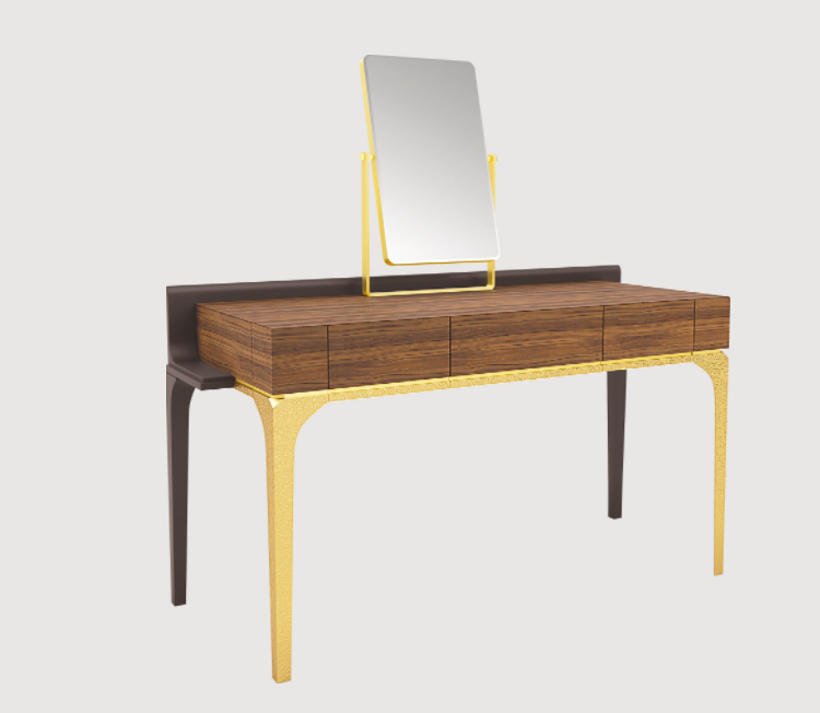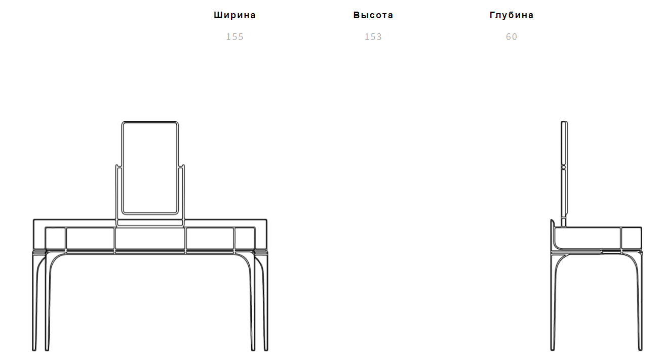 Туалетный столик Mademoiselle представляет собой гармоничное сочетание классических форм и современного дизайна. Его гладкие линии и изысканные детали создают впечатление лёгкости и воздушности. Металлические ножки и ручки, выполненные с особой тщательностью, добавляют нотки современности, в то время как зеркало на металлической опоре дает возможность создать эффект глубины и света в вашем пространстве.