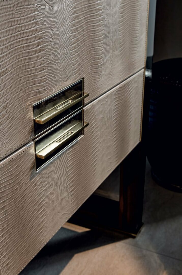 Откидная створка с зеркалом и металлической кромкой добавляет практичности и удобства в использовании. Профиль основания и рамка выполнены из шлифованного металла с различными отделками, включая глянцевое золото и матовую сатинированную бронзу, что подчеркивает статусность данного предмета мебели. Уникальная ручка со вставкой из мрамора служит завершающим штрихом, подчеркивающим премиальность дизайна.