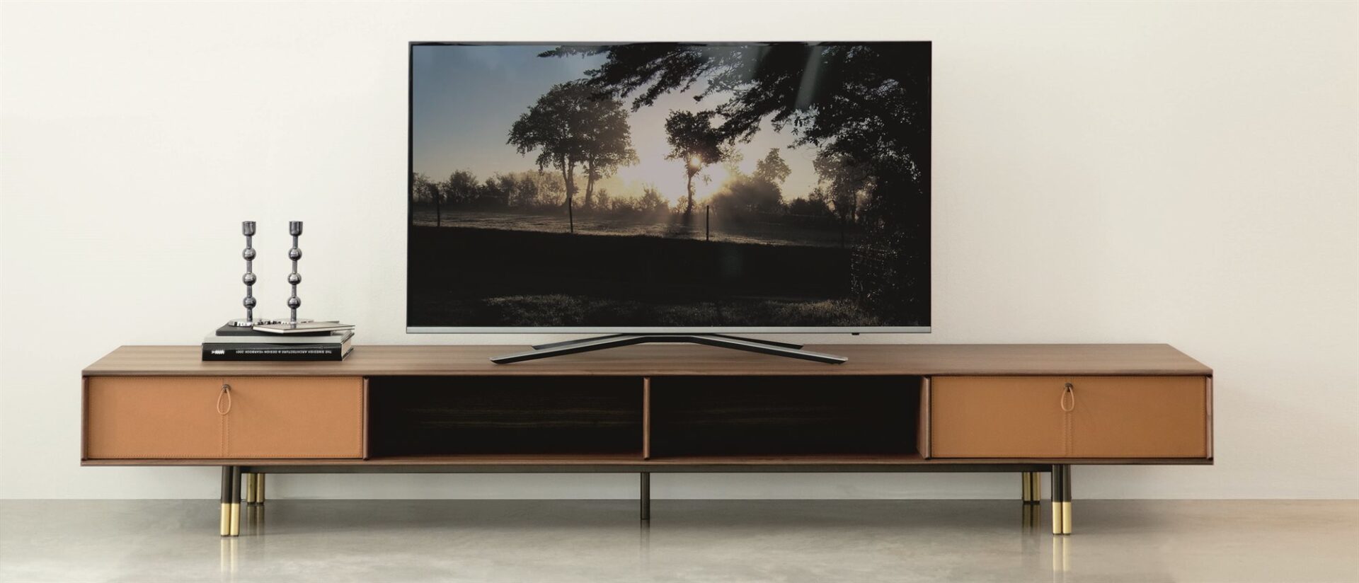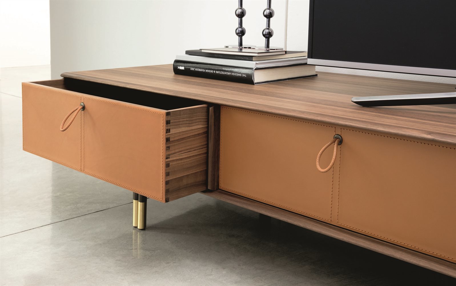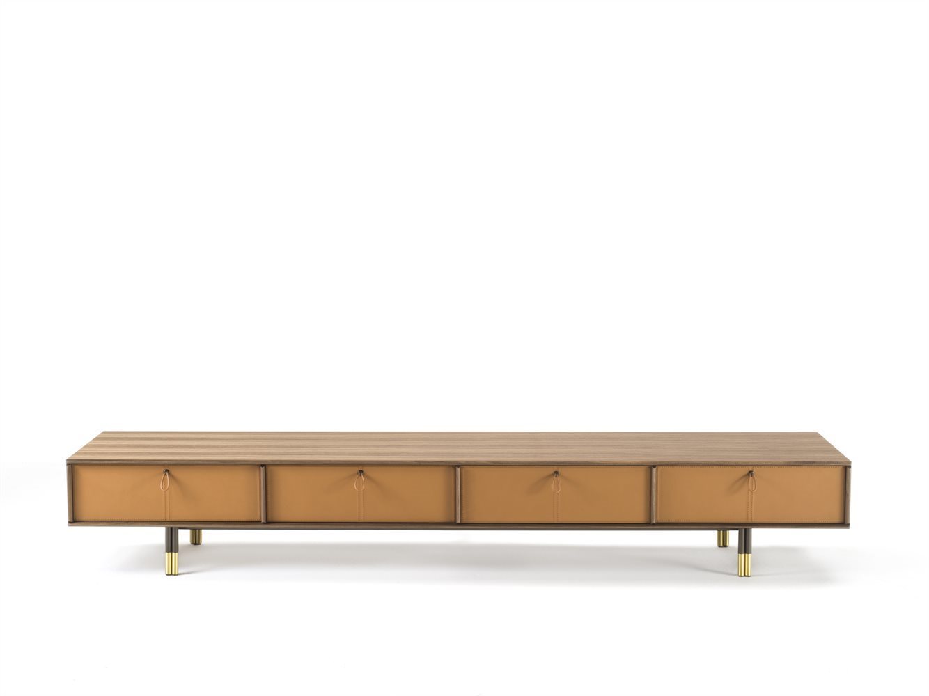 ТВ тумба Bayus привлекает внимание своим изысканным дизайном, выполненным из высококачественного орехового дерева каналетта. Нежный и теплый оттенок дерева гармонично сочетается с металлическим основанием из Bronzoro, создавая визуальный контраст, который добавляет изделию современности. Профили из массива дерева и матовые латунные наконечники придают тумбе элегантный и респектабельный вид, который идеально впишется в любой интерьер — от классического до современного.