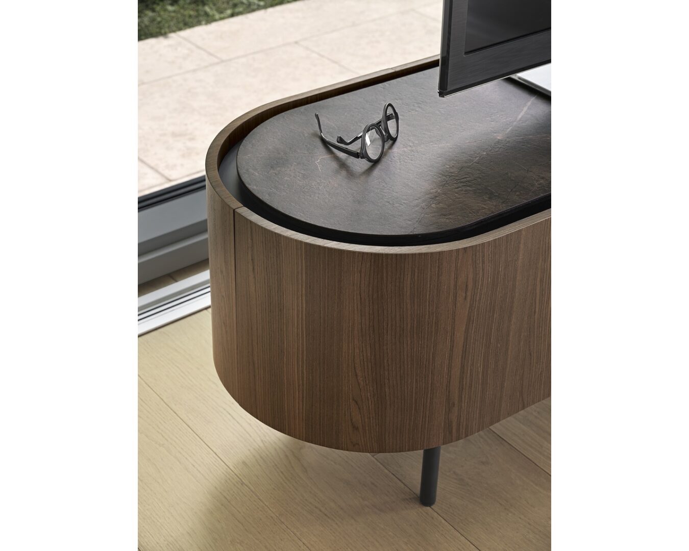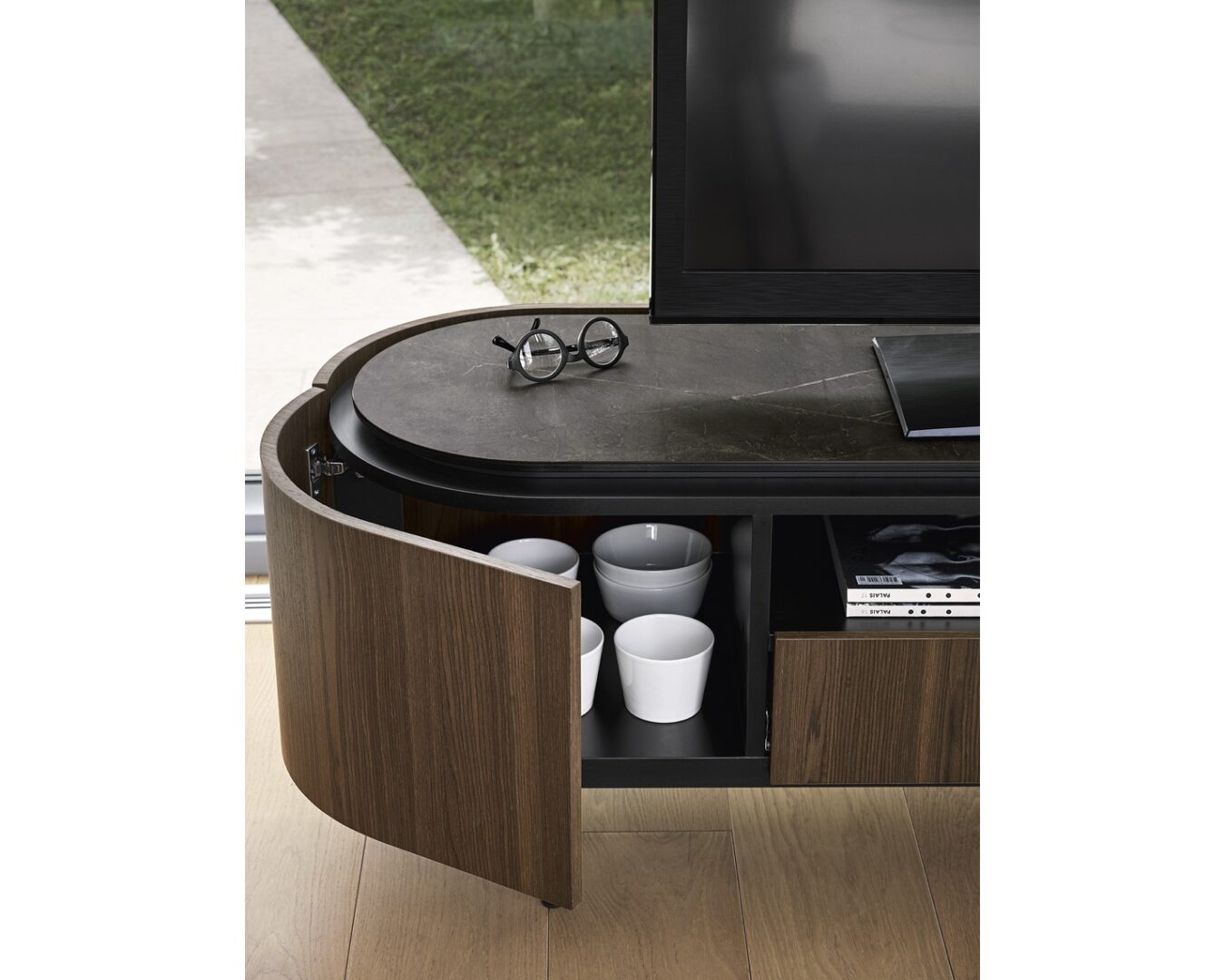 Итальянская ТВ тумба LAKE CS6076-2 от CALLIGARIS – элегантное решение для современного интерьера. Модель с матовым черным металлическим основанием и закругленной формой дополнена овальной керамической столешницей, создающей удобный зазор для легкого открывания дверц.
