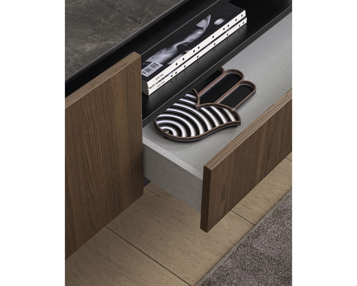 Полностью покрыта шпоном, что обеспечивает безупречный вид со всех сторон. В центральном отсеке предусмотрено техническое отверстие для кабелей, делая эксплуатацию еще удобнее. Размеры: ширина 180 см, глубина 48 см, высота 44 см.