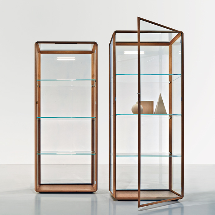 Витрина 45° от итальянской фабрики Molteni&С — элегантное решение для демонстрации драгоценных предметов и книг. Поворотные полки со скосом 45° создают эффектную динамику, а алюминиевые профили с шпоном ценных пород дерева подчеркивают премиальный статус изделия. Металлические соединения обеспечивают плавное вращение, а скрытый механизм сохраняет чистоту линий. Итальянское качество и продуманный дизайн делают эту витрину стильным акцентом в любом интерьере.