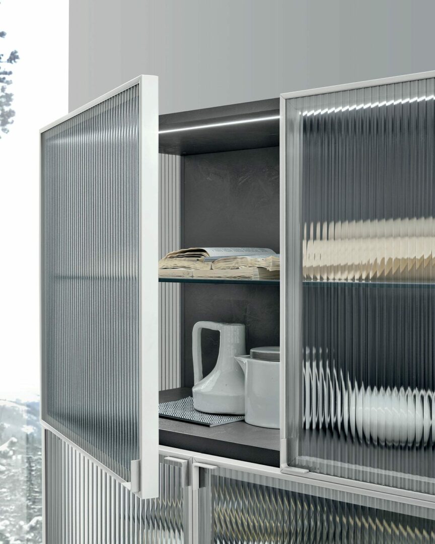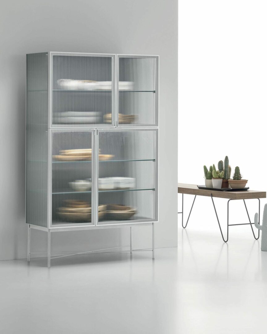 Витрина NINA отличается изысканной застекленной конструкцией, выполненной с использованием качественного стекла «canetté». Ее размеры: ширина 100 см, глубина 43 см, высота 166 см — идеальны для размещения в любом помещении, от уютной гостиной до элегантной столовой. Стальная структура придает витрине прочность и долговечность, а также создает визуальный акцент, который привлекает внимание.