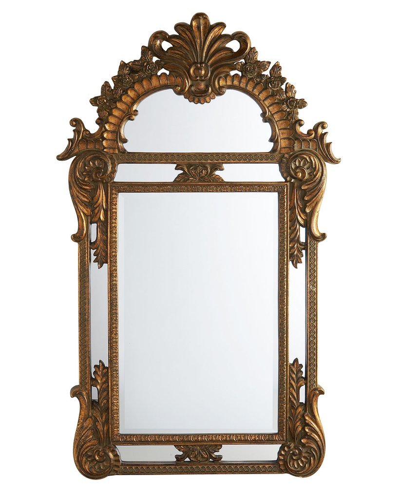 Зеркало CAMDEN от фабрики LOUVREHOME – роскошное настенное зеркало в стиле барокко с арочной формой и двойной рамой. Витиеватый растительный орнамент и цветочная композиция в верхней части придают изделию королевский шарм. Рама выполнена в оттенке античного золота, подчеркивая классическую элегантность.