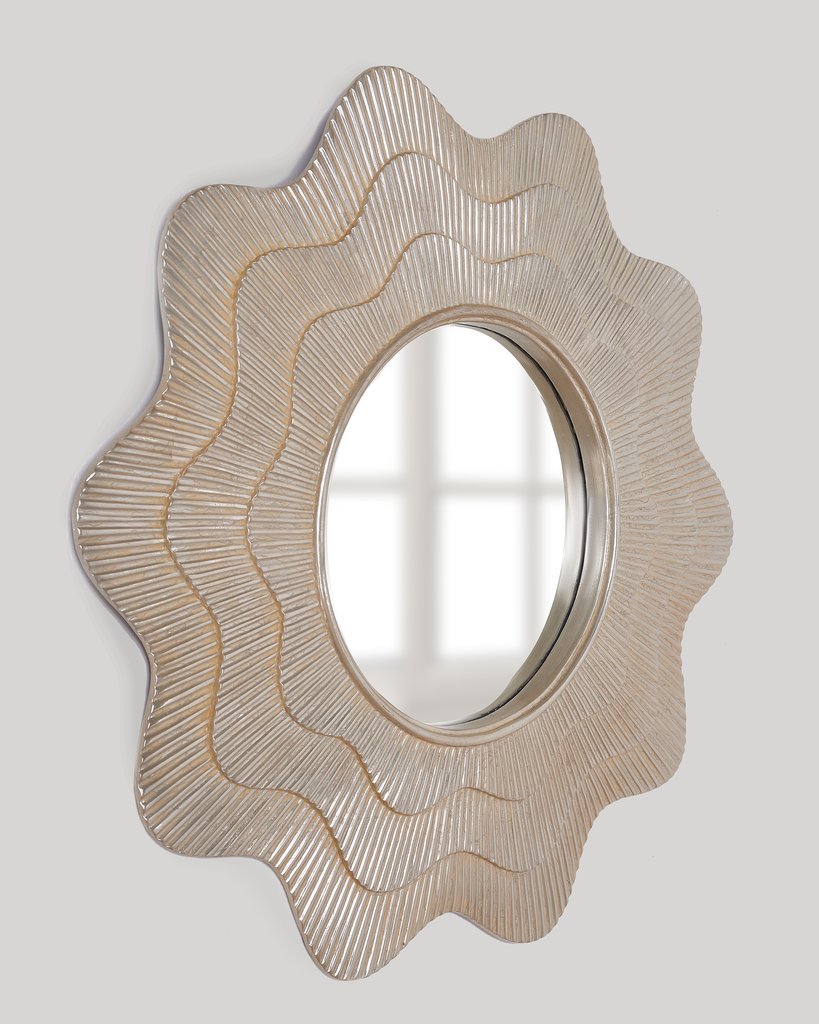 Зеркало MARAYA SILVER выполнено в форме санбёрста — динамичного круга с расходящимися лучами, напоминающими солнечные блики. Такое решение придает интерьеру легкость и визуальную глубину, а серебристая рама добавляет нотку современной элегантности. Размеры зеркала (89 × 89 см) делают его идеальным акцентом для гостиной, спальни или прихожей, где оно будет притягивать взгляды и создавать эффект простора.