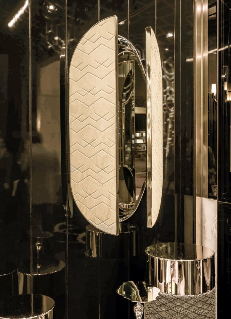 Натуральное скошенное зеркало толщиной 4 мм и каркас из шлифованного металла доступны в различных отделках: от элегантного Black Rose до матового золота оттенка Шампанского. Выберите декор «Diamond» или «Sequence» для уникального стиля.