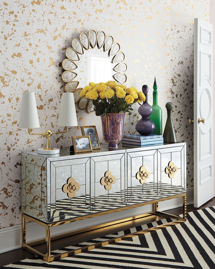 Зеркало PLYMOUTH выполнено в форме идеального круга диаметром 80 см, что делает его универсальным элементом декора для гостиных, спален и даже гардеробных. Рама, покрытая благородным золотым оттенком, гармонично сочетается с вставками из натурального перламутра, создавая эффект мерцающего сияния. Такой дизайн отсылает к традициям китайского искусства, где перламутр символизирует роскошь и долговечность.