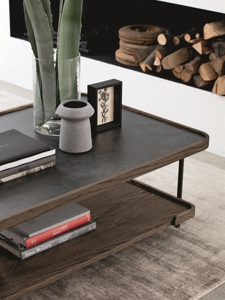 Этот стильный прямоугольный столик впечатляет своей металлической структурой в отделке Bronzoro и столешницами из ясеня или камня. Изящные ножки из матовой латуни придают изделию премиальный вид и устойчивость.
