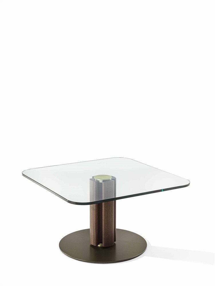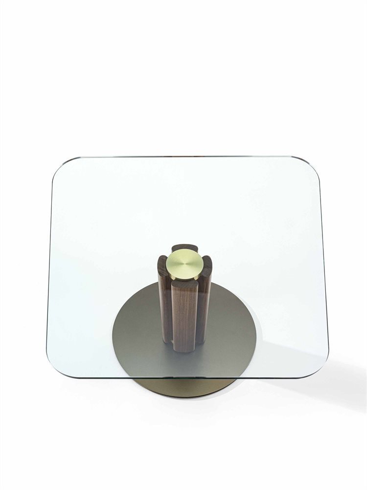 Элегантный столик с центральной ножкой из массива ореха каналетта или ясеня, установленной на стильном металлическом кольце с отделкой Bronzoro. Столешница, выполненная из прозрачного стекла (толщина 15 мм), дополнена латунной пластиной, сваренной методом электросварки с использованием УФ-излучения.