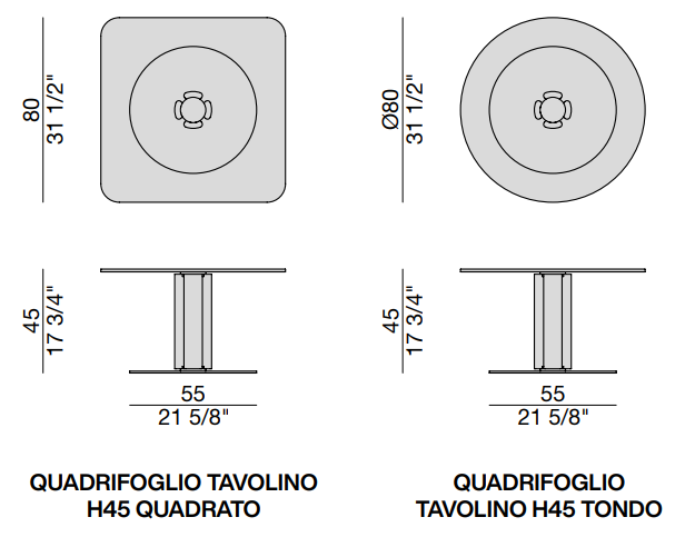 Столик указан как Quadrifoglio tavolino h45 — высота 45 см. Стеклянная столешница толщиной 15 мм.