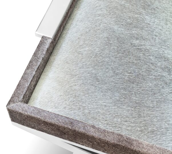 Каждый элемент этого столика говорит о благородных материалах и высоком мастерстве. Хромированная сталь не только привлекает взгляд, но и гарантирует долговечность, а стеклянное покрытие защищает уникальную текстуру волос буйвола от повреждений, подчеркивая его естественную красоту.