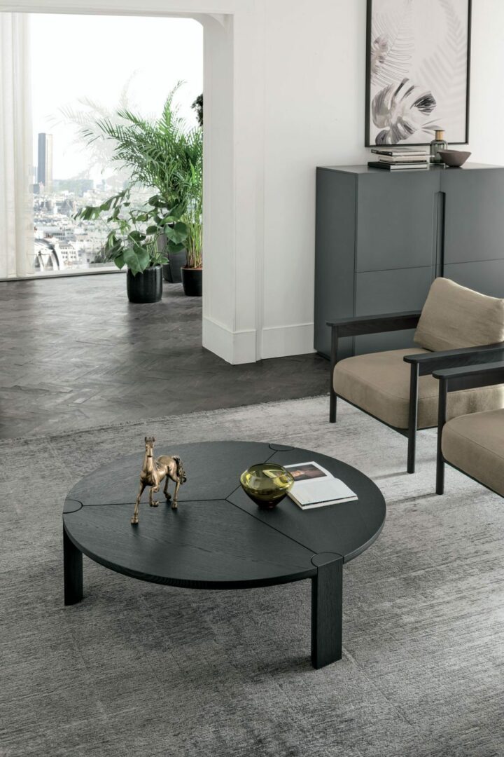 Журнальный столик Bite от итальянской фабрики Tomassella — элегантное решение для современной гостиной. Изготовлен из дерева, его оригинальный дизайн включает три сегмента, соединённых ножками, образующими идеальный круг. Диаметр столешницы — 110 см, высота — 30 см.