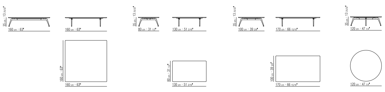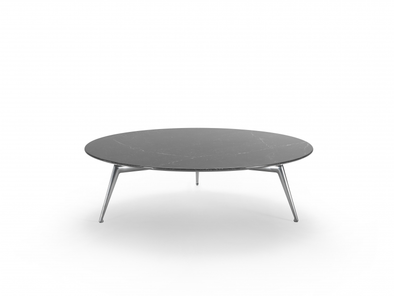 Столешница доступна в различных вариантах: благородные породы дерева (грецкий орех Canaletto, ясень, венге) с богатой палитрой оттенков, а также элитные мраморы (Calacatta Oro, Nero Marquinia, Bianco Carrara). Ножки из литого алюминия представлены в сатинированных, хромированных и полированных покрытиях, включая эксклюзивное шампанское.