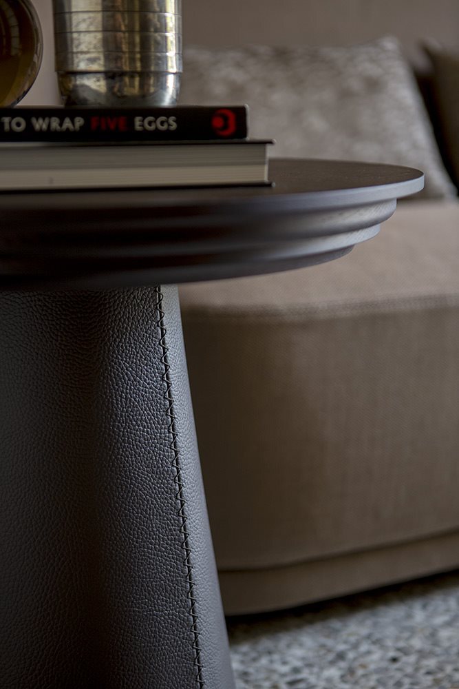 Основой столика является прочная деревянная конструкция, покрытая высококачественной кожей, что обеспечивает долговечность и легкость в уходе. Этот материал придаёт изделию роскошный вид и приятные тактильные ощущения. Столик не только красив, но и практичен, что делает его идеальным выбором для ежедневного использования.