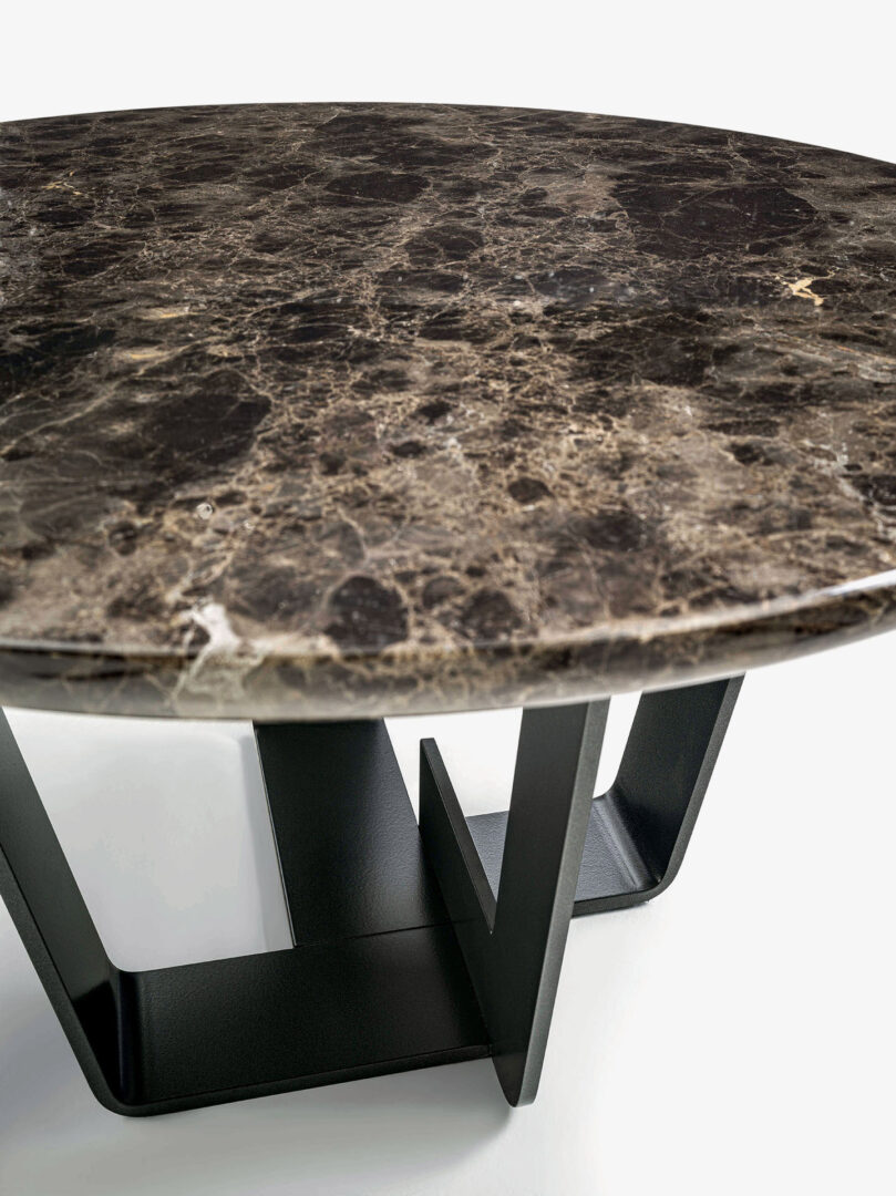 Мраморная столешница представлена в благородных оттенках: темный эмперадор, зеленые Альпы и калакатта. Металлическое основание имеет 12 вариантов покрытия по шкале RAL, включая жемчужный белый, античную бронзу и титановый эффект. Идеальное решение для современных интерьеров с акцентом на качественные материалы и итальянский дизайн.