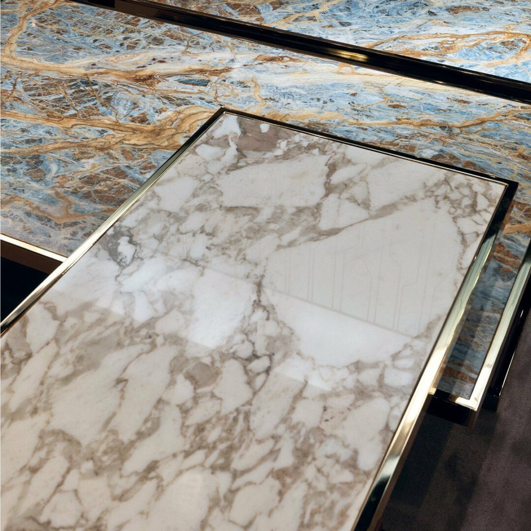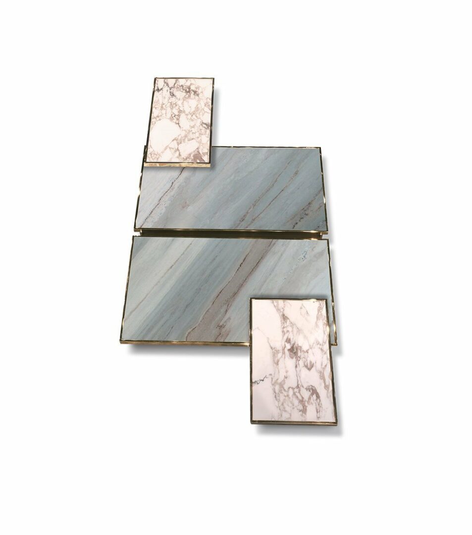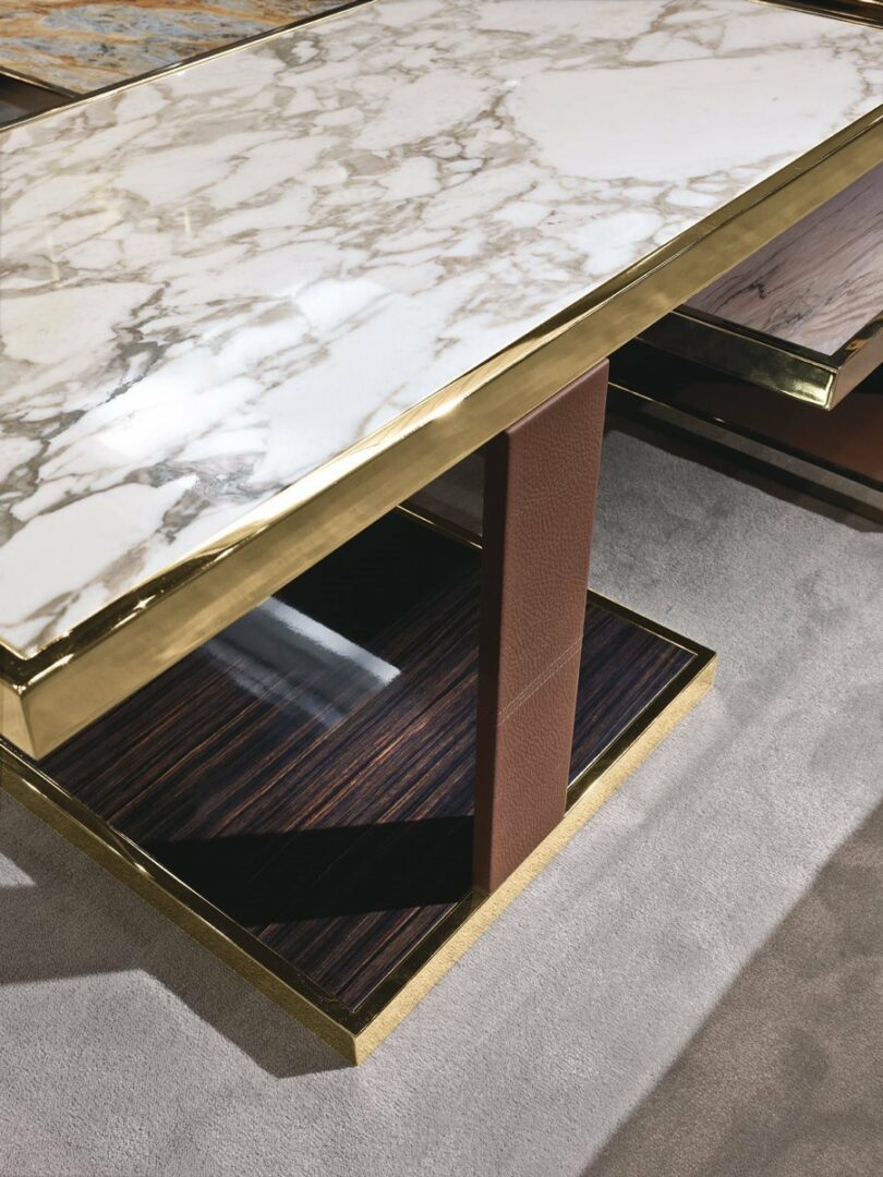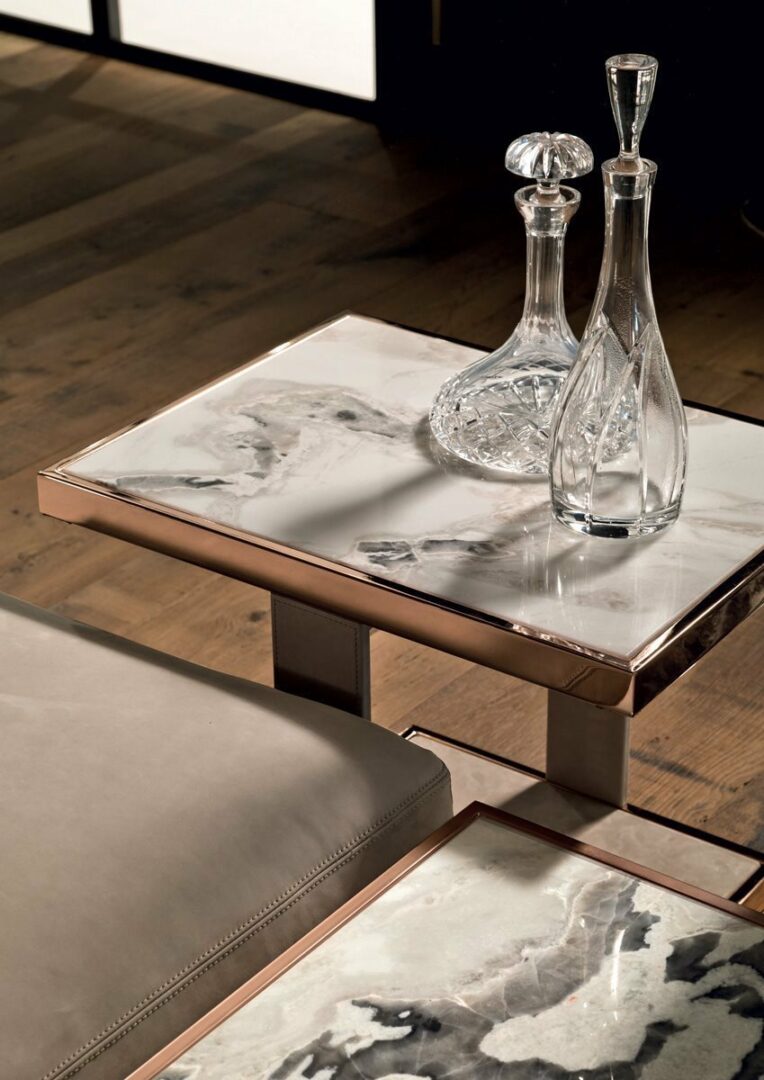 Столик LAYER имеет прочный металлический каркас, доступный в разнообразных отделках, таких как матовое золото, глянцевый хром и даже благородное черное хромирование. Эстетика изделия подчеркивается изысканными столешницами, выполненными из мрамора различных оттенков — от изумрудного Verde Guatemala до глубокого черного Agatha Black. Также доступны варианты с бронзовым или дымчатым зеркалом, что добавляет дополнительный шарм.