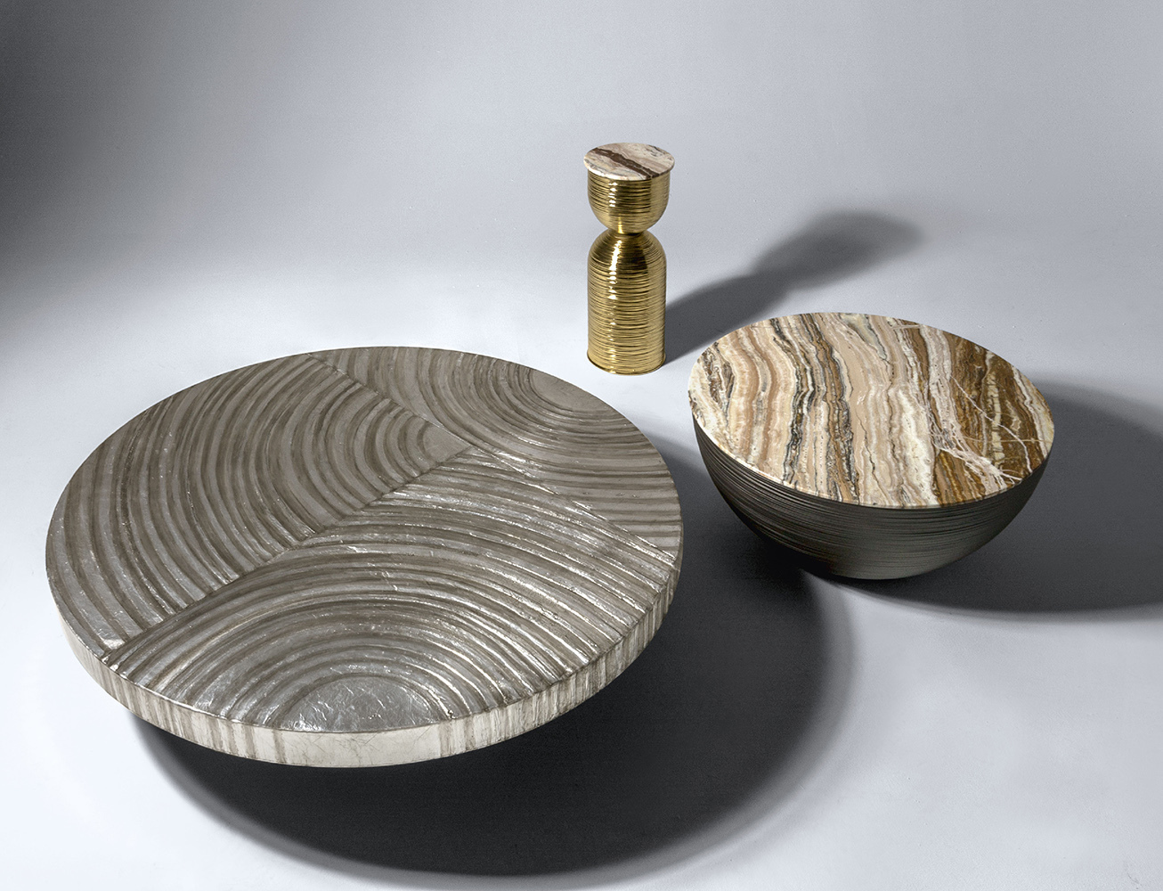Круглый столик Otto выделяется своим оригинальным дизайном: основание из матового металла в форме полусферы проходит процесс скальфирования, создавая великолепные декоративные гравировки. Столешница, выполненная из тонкой алюминиевой фольги, формована с радиусными рисунками, что придаёт ей невероятную лёгкость и воздушность. Сложный процесс обработки смолы позволяет сохранить трёхмерность в кромке, что делает стол уникальным и запоминающимся.